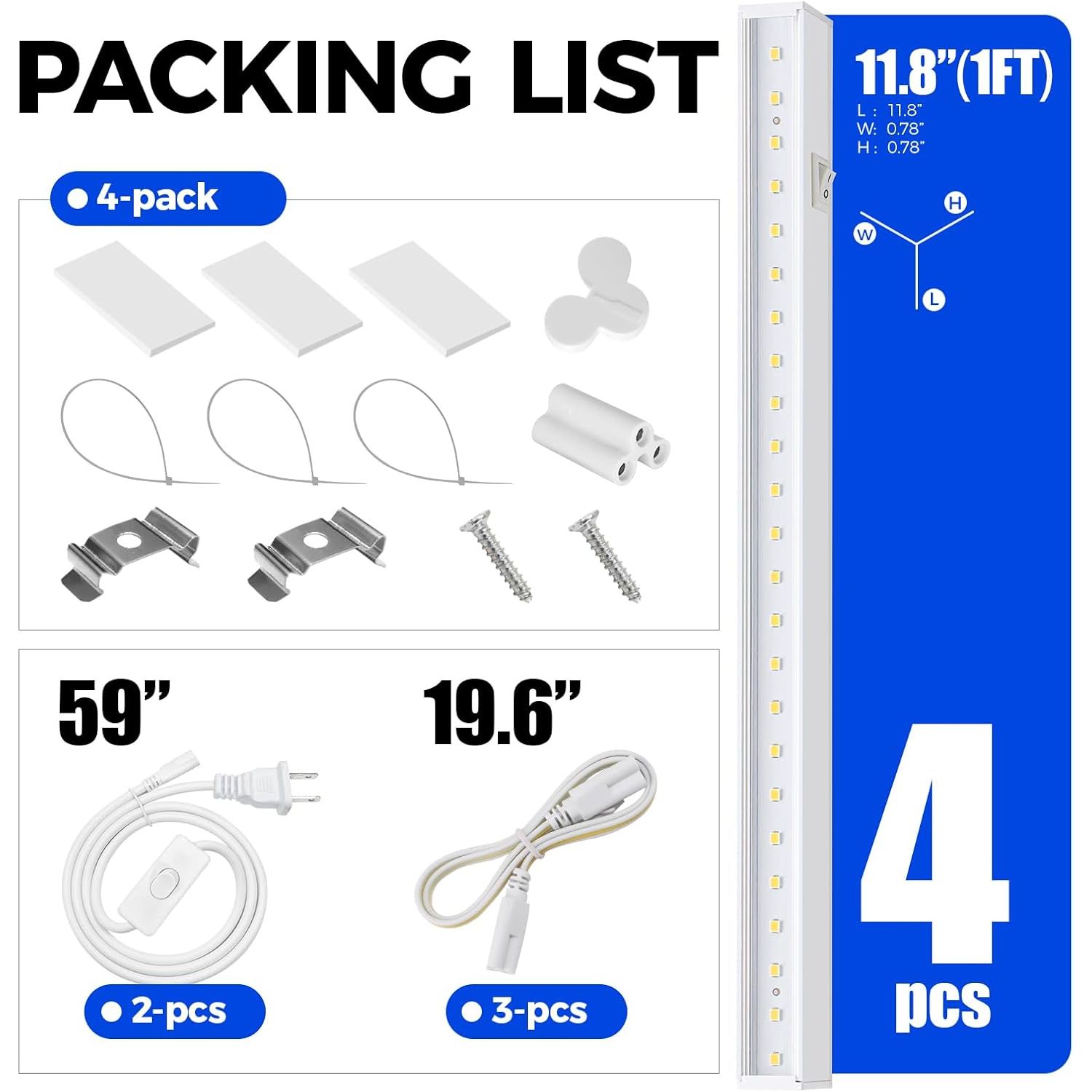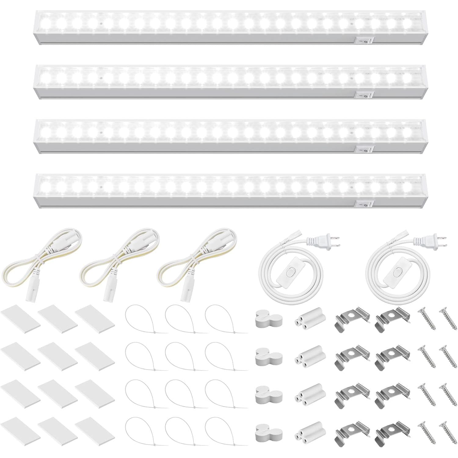- What You Get: 4 x Barrina T5 Grow Lights, 2 x Power Cords with ON/OFF Switch, 4 x Connecting Cords(20''), 4 x Small Connectors, 8 x Installation Clips, 12 x Double-sided Tapes, 12 x Cable Ties