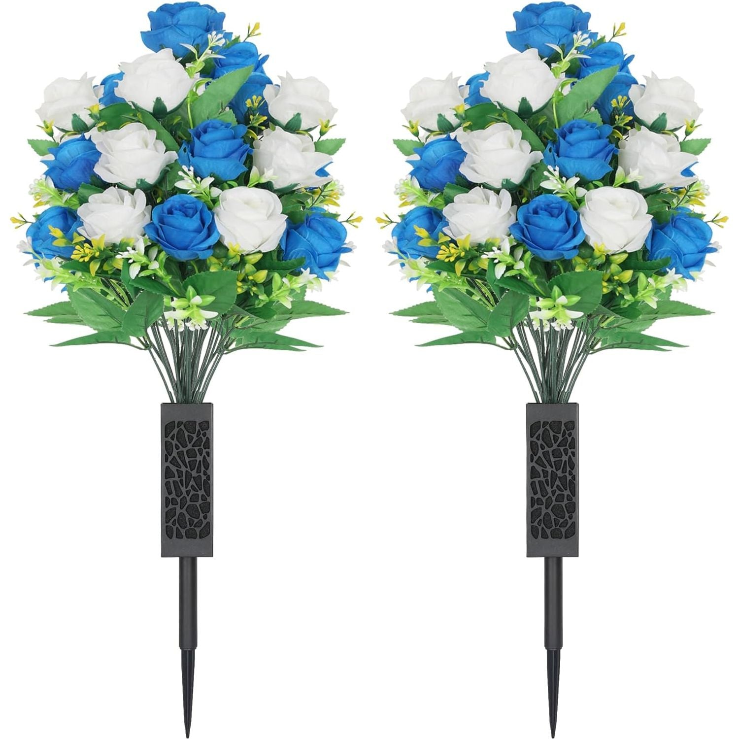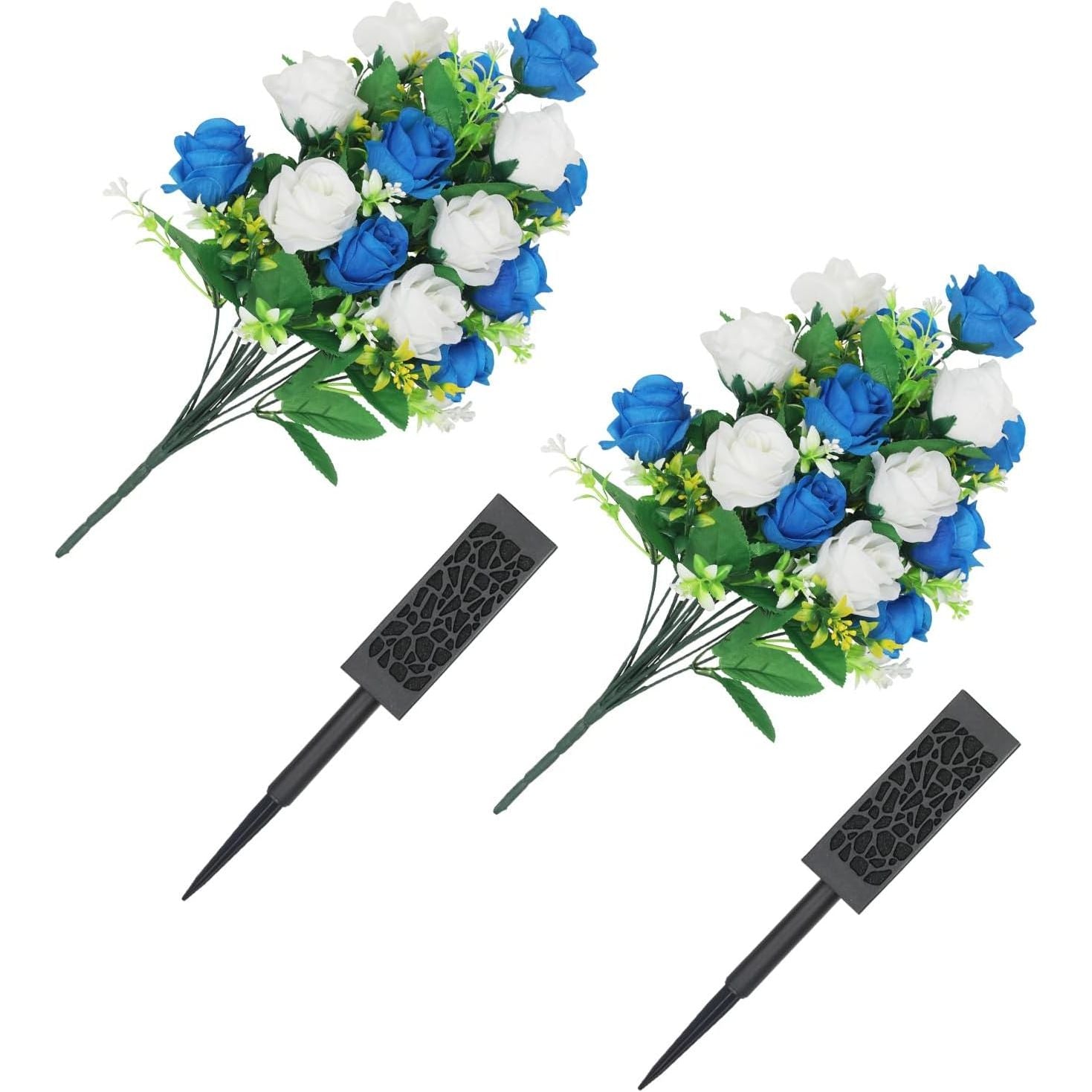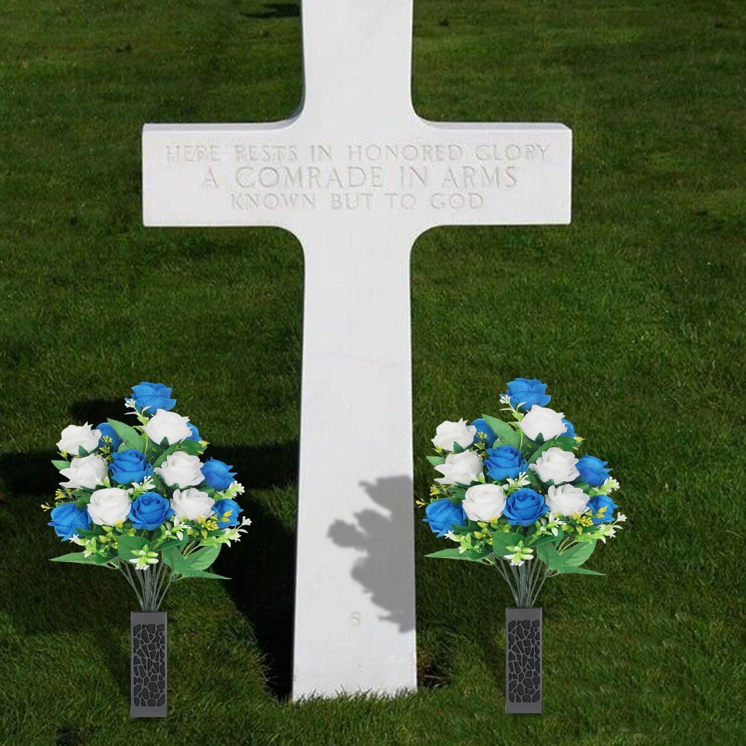 2 Sets Artificial Cemetery Flowers,Artificial Cemetery Flowers with Vase,Memorial Flowers,Artificial Rose Bouquet Graveyard Memorial Flowers for Cemetery Headstones Decoration (Dark Blue and white) - Just Closeouts Canada Inc.
