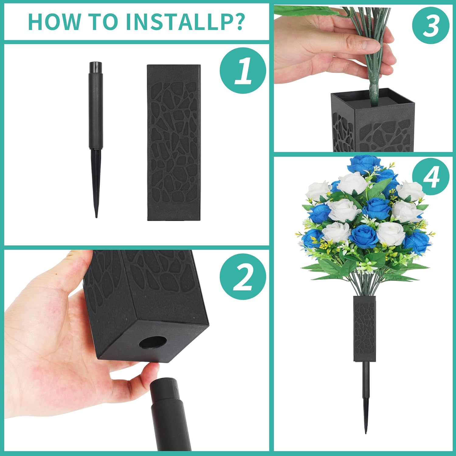 • Size-Artificial graveyard flowers have 18 white rose flowers and greenery leaves. Artificial flowers bouquet is approx. 17.7'' tall. Black vase size: 2.4inch (L) x 2.4inch (W) x 11inch (H), support stake size: 5.3inch.1" - 2" longer than other vases.
