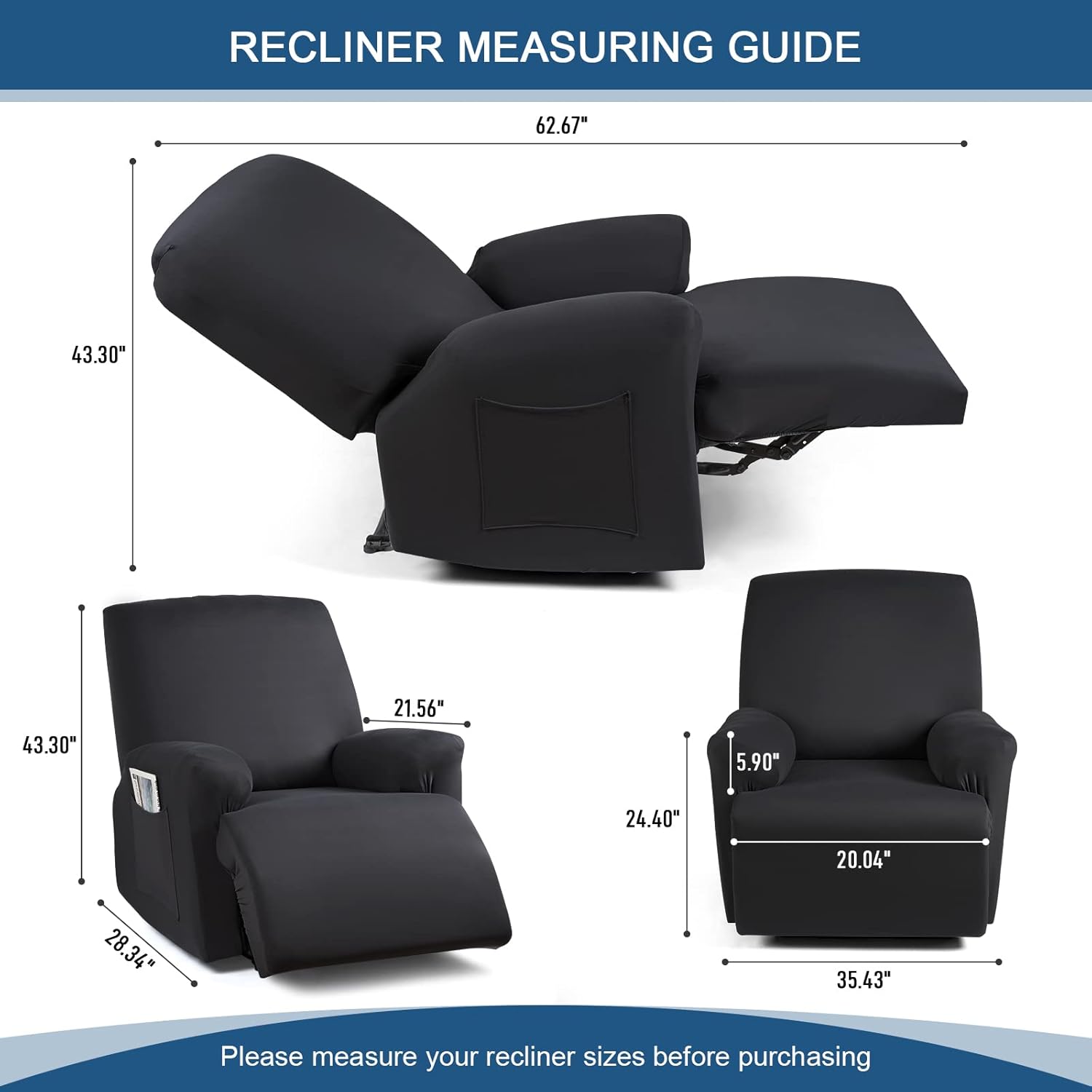 • 【PERFECT FIT】Our 3-piece Recliner Chair Cover is designed to fit most recliner chairs with a middle console. It includes 3 separate pieces: 1 siamese seat cover, 1 left side cover, and 1 right side cover. The cover is tailored to fit reclining single seat sofas with seat widths from 25" - 39" inches. Please follow the measurement guide to ensure a perfect fit. Double-checking the dimensions is recommended to avoid sizing issues.