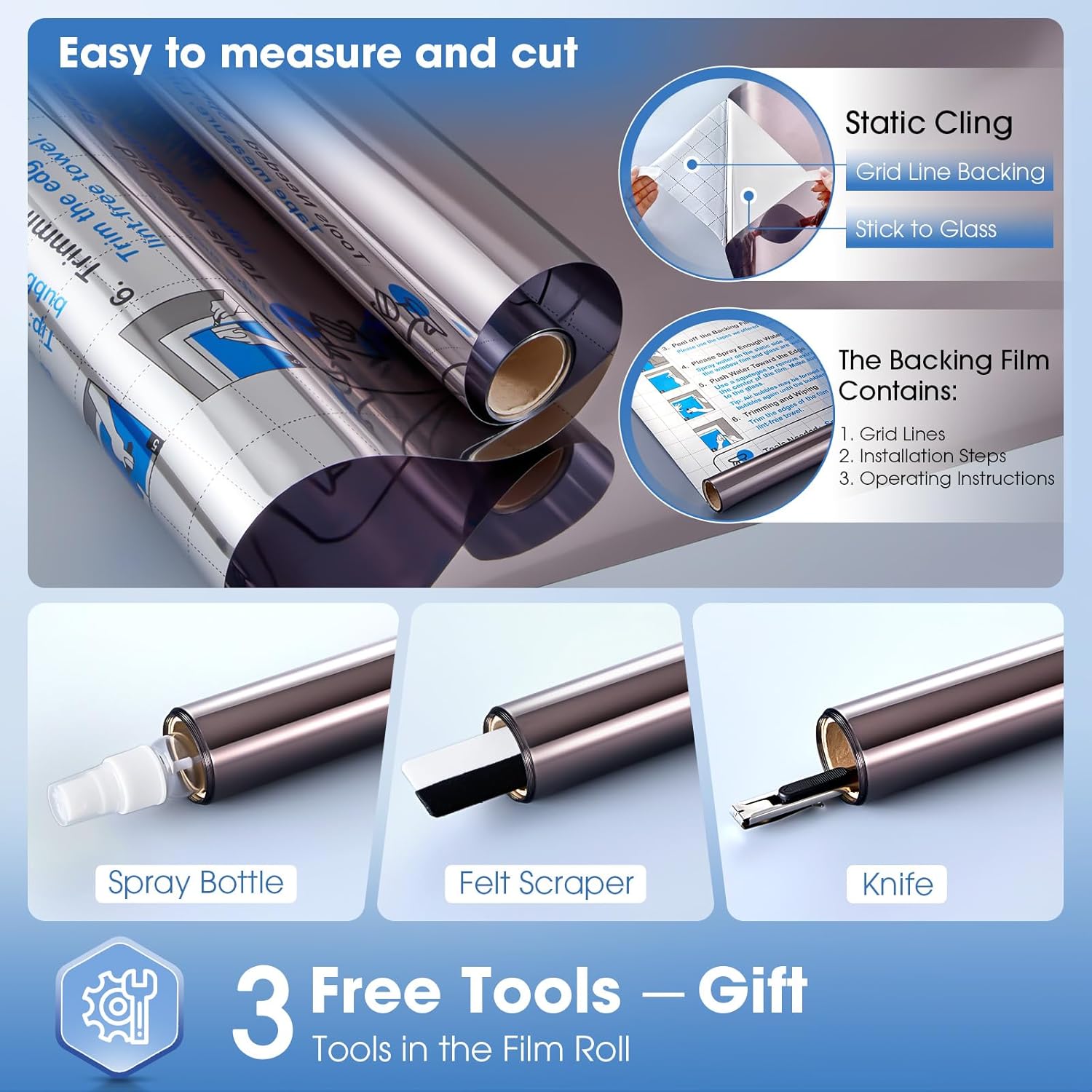 • Easy to Install & With Tools: Our solar film package contains 3 installation tools - Felt Scraper, Knife, Spray Bottle, easy to handle the installation without extra hassle; The backing of the film is lattice lines to ensure that the sun film is cut accurately, fits well and is beautiful! The installation process is fast and smooth, saving your valuable time
