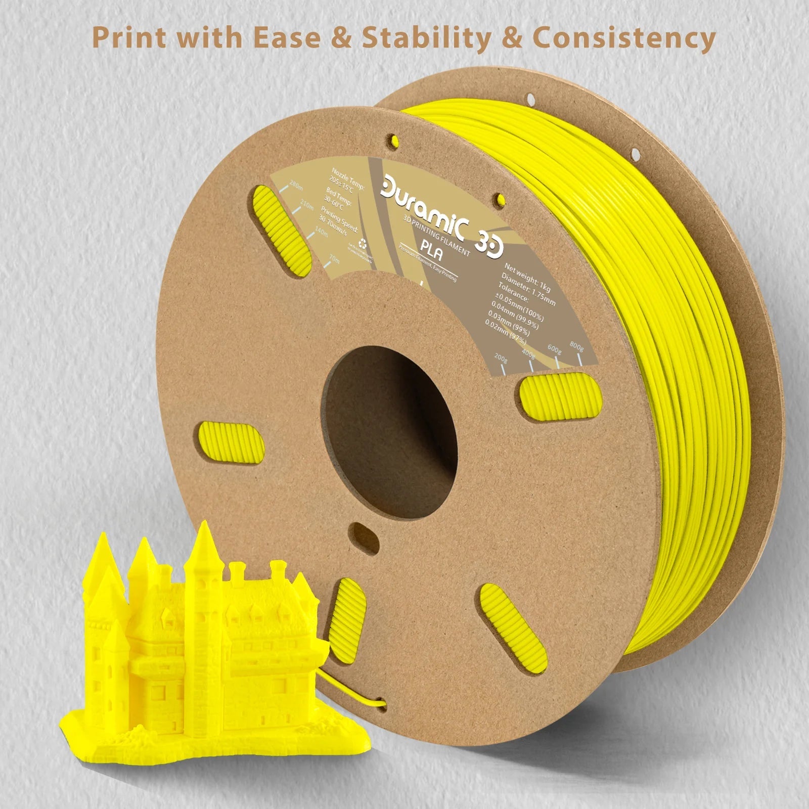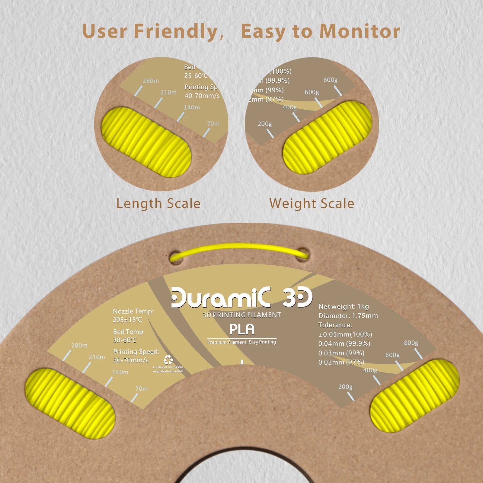 - 【Upgraded Cardboard Spool】Duramic 3D Pinter PLA filament 1.75mm use cardboard spool along with dual stickers, which allows convenient sorting and full recycling. The filaments remain the same formula and quality.