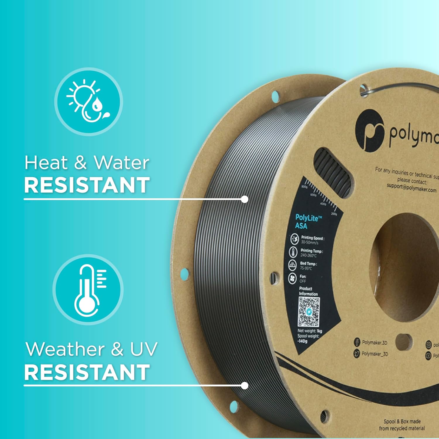 • 🌡️ 【High Heat Resistance and Mechanical Properties】 - PolyLite ASA can resist temperatures up to 100˚C (212°F) and display high toughness and impact resistance for functional application. (Same properties as 3D printer filament ABS)