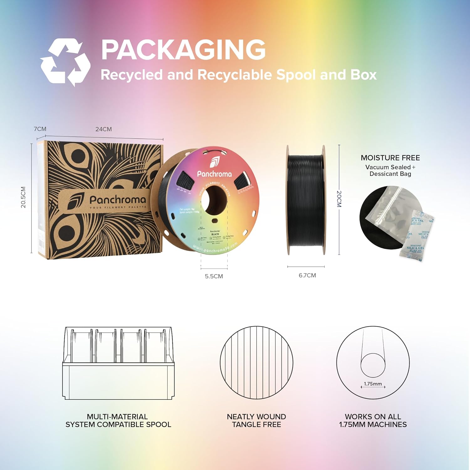 • Cardboard Spool with Reinforced Edge: Panchroma 3D printer PLA filament is packaged in upgraded, fully recycled cardboard with an enhanced coated edge. This hard edge prevents dust accumulation and protects against deformation and delamination.