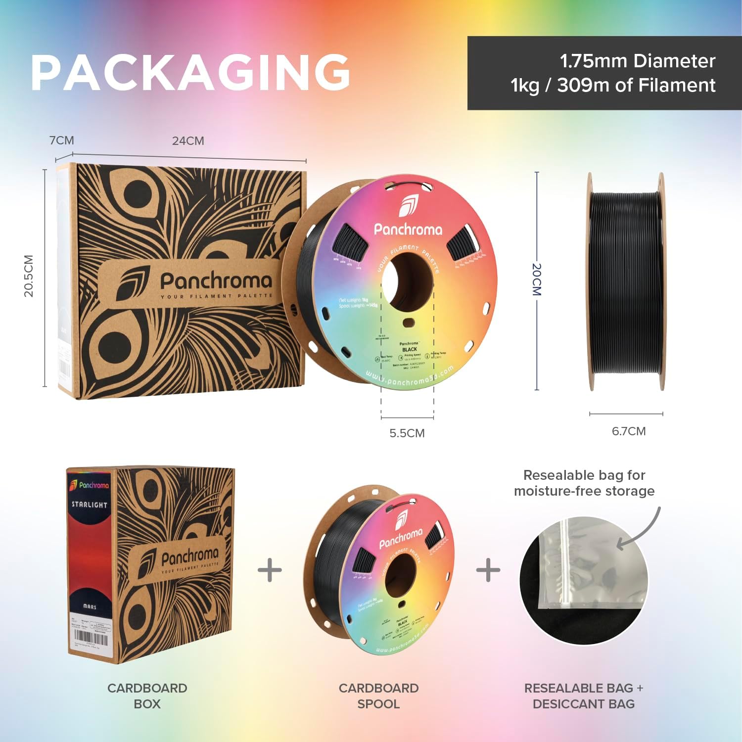 - Cardboard Spool with Reinforced Edge: Panchroma 3D printer filament features upgraded packaging with a coated edge and a fully recycled cardboard spool and box. The reinforced edge prevents dust accumulation and protects against deformation and delamination.