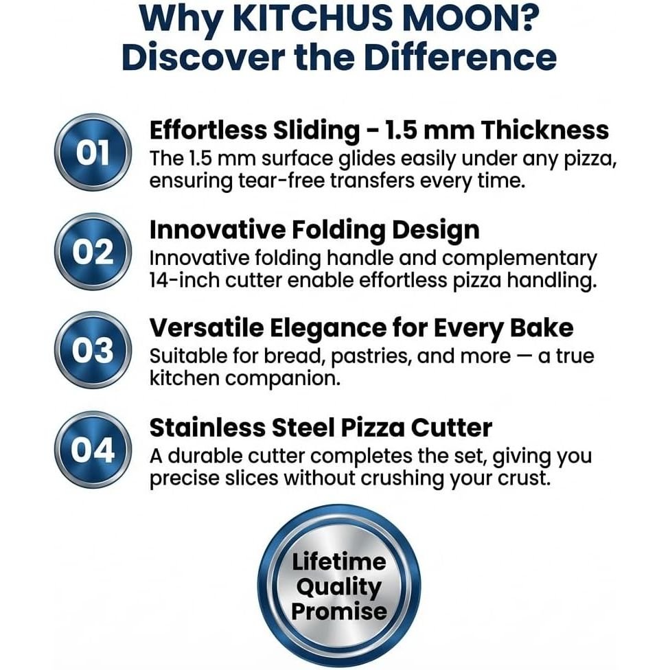 - PERFECT SIZE FOR LARGE HOMMEMADE PIZZA: Kitchus Moon pizza peel 16 inch was designed to prepare and transfer both small and large homme-made pizza easily. If you would love to make large pizza for your family, it is easy to prepare and transfer even up to 16 inch pizza with this pizza shovel