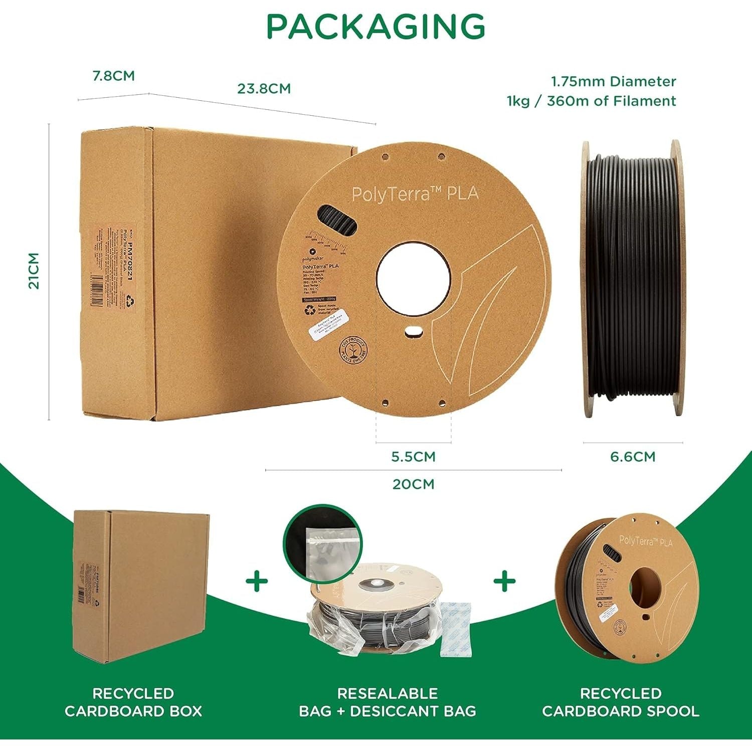 - ♻️ Cardboard Spool: Polymaker PolyTerra 3D printer PLA Plus spool and packaging are made from fully recycled cardboard, ensuring both style and quality.