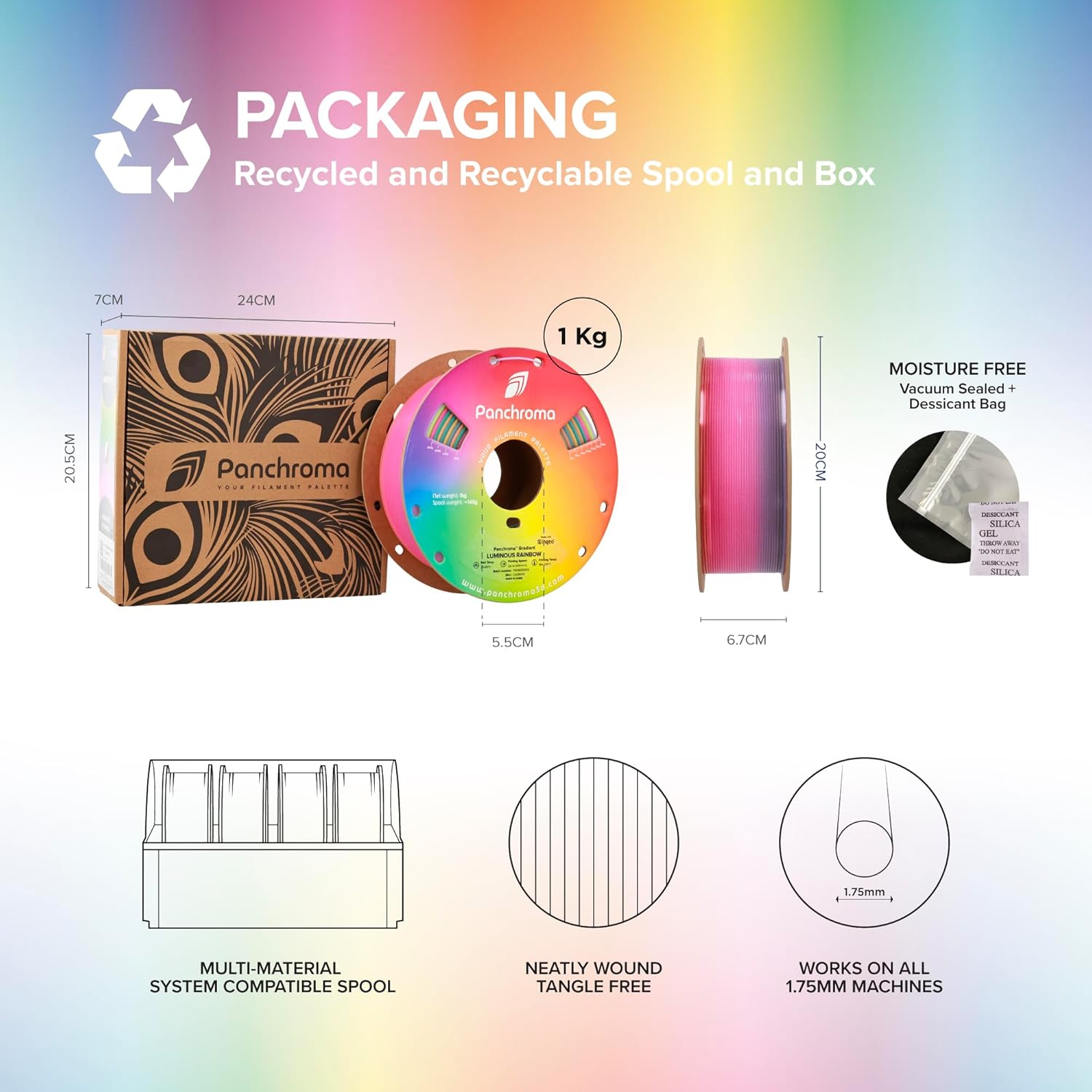- Tangle-Free & Moisture-Free: Quality is our top priority. Panchroma 1.75mm Gradient Luminous Rainbow PLA filament is carefully wound to prevent tangling, dried, and vacuum-sealed in a resealable ziplock bag with desiccant. Note: Pass the filament through the fixed hole after use to avoid tangles.