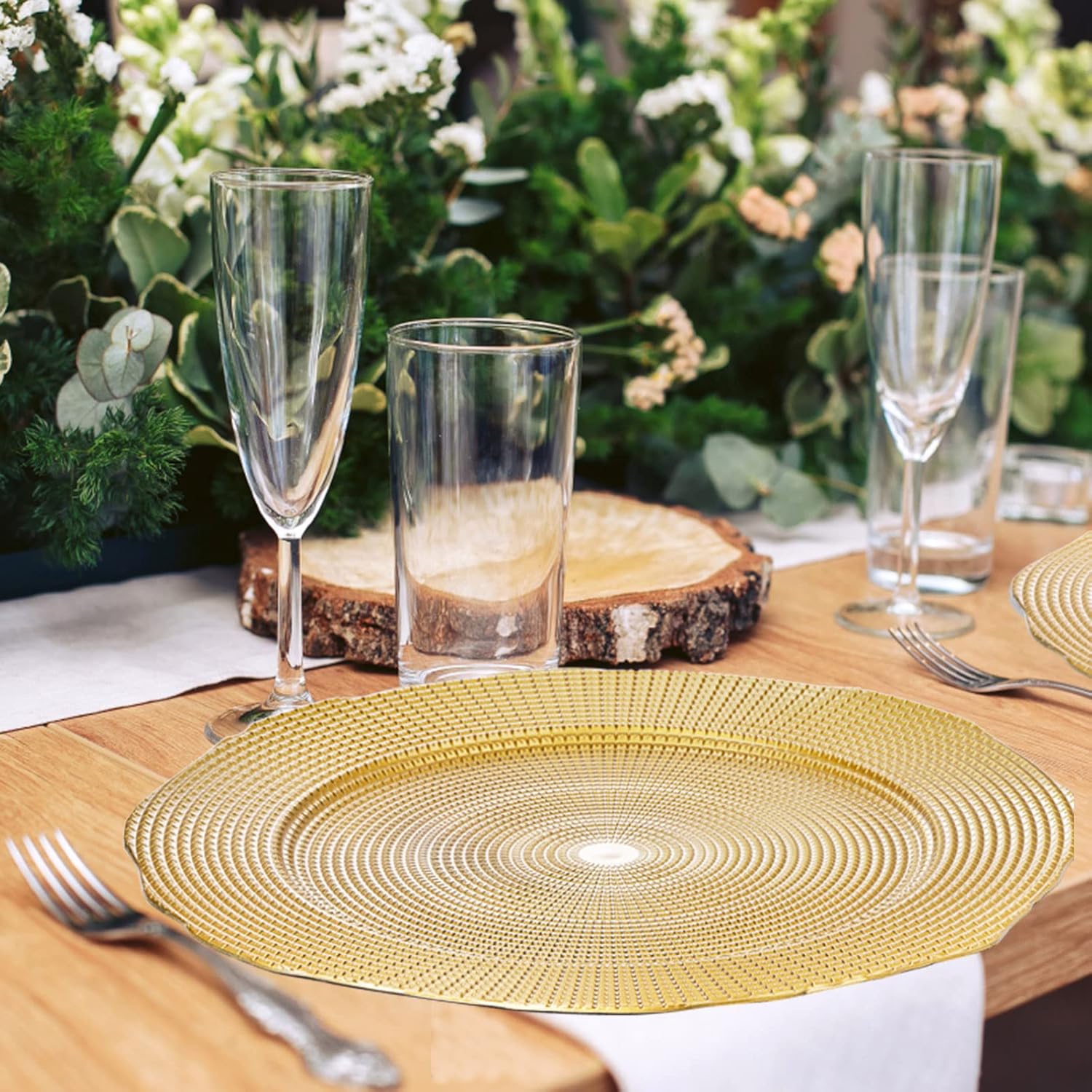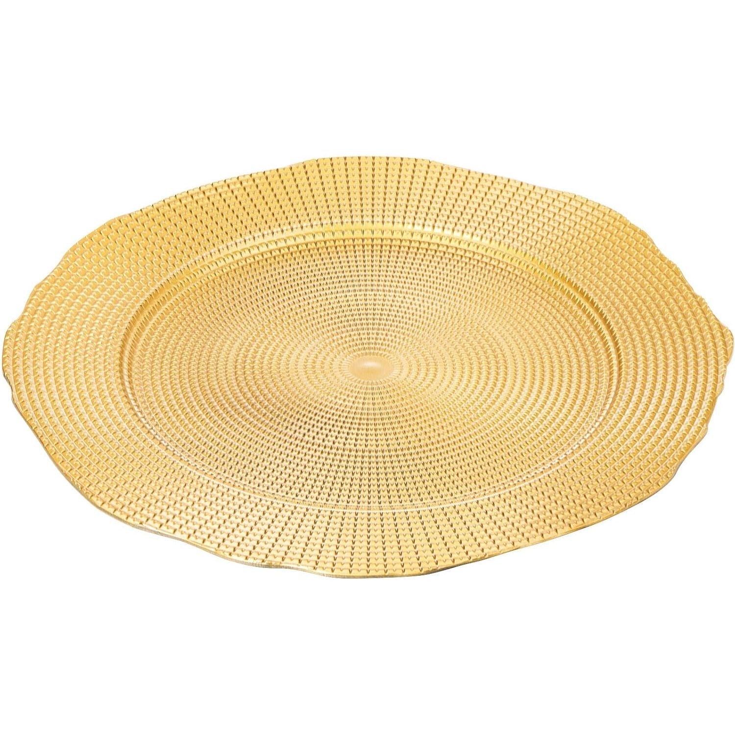 - The surface of plastic charger plates is carved with geometric texture and full of the aesthetics, each gold serve plate is designed with irregular ruffles edge and overall is classic round shape, have high end looking, which is inexpensive way of elevating the class of any dinner table!