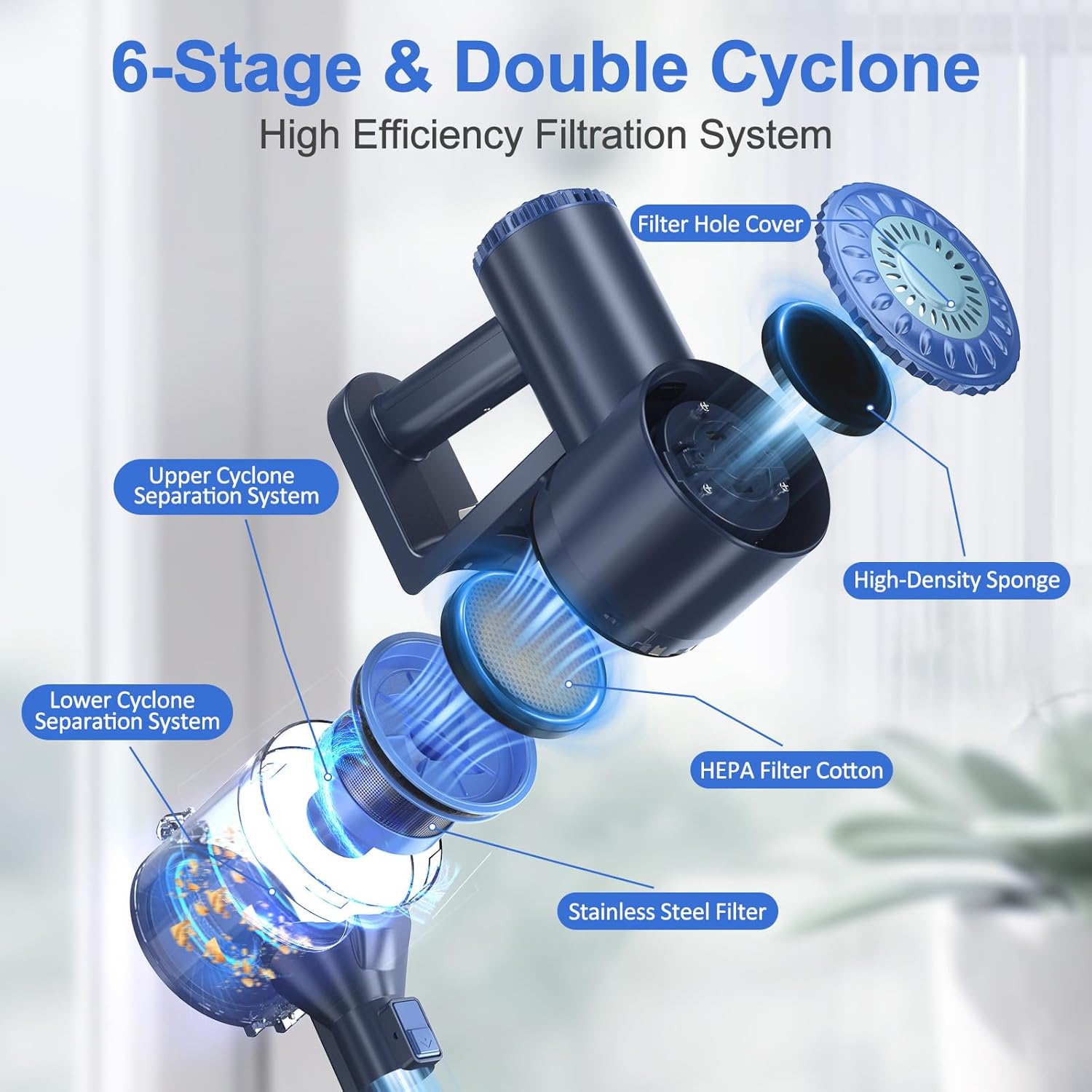 • 💡[6-STAGE HEPA FILTRATION SYSTEM]:Cordless vaccum hold breakthrough 6-Stage Double-Cyclone filtration system ensures that 99.98% of microscopic dust particles as small as 0.1 microns are filtered out, Upgrade refiltration system to avoid secondary pollution during cleaning and protect your family's health.