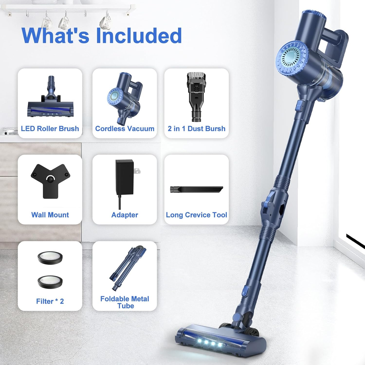 • 💡[POWERFUL SUCTION]: Our Vacuum cleaners cordless hlod 25000Pa powerful suction and 2 speed levels for deep cleaning on carpets, hardwood floors, etc. Upgraded vacuum floor brush effectively removes dirt and hair hidden in the carpet without tangling.