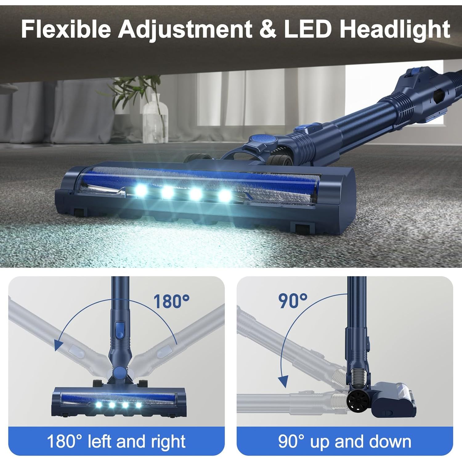 • 💡[LARGE-CAPACITY BATTERY] W400 stick vacuum built in 6 *high-capacity battery and lightning fast charging supports super long running time to meet your daily cleaning needs. Otherwise,The vacuum cleaner’s brushless motor generates less noise under 63dB. Also comes with LED headlights effectively clean particles and dust in dark places which provide a deeper cleaning.