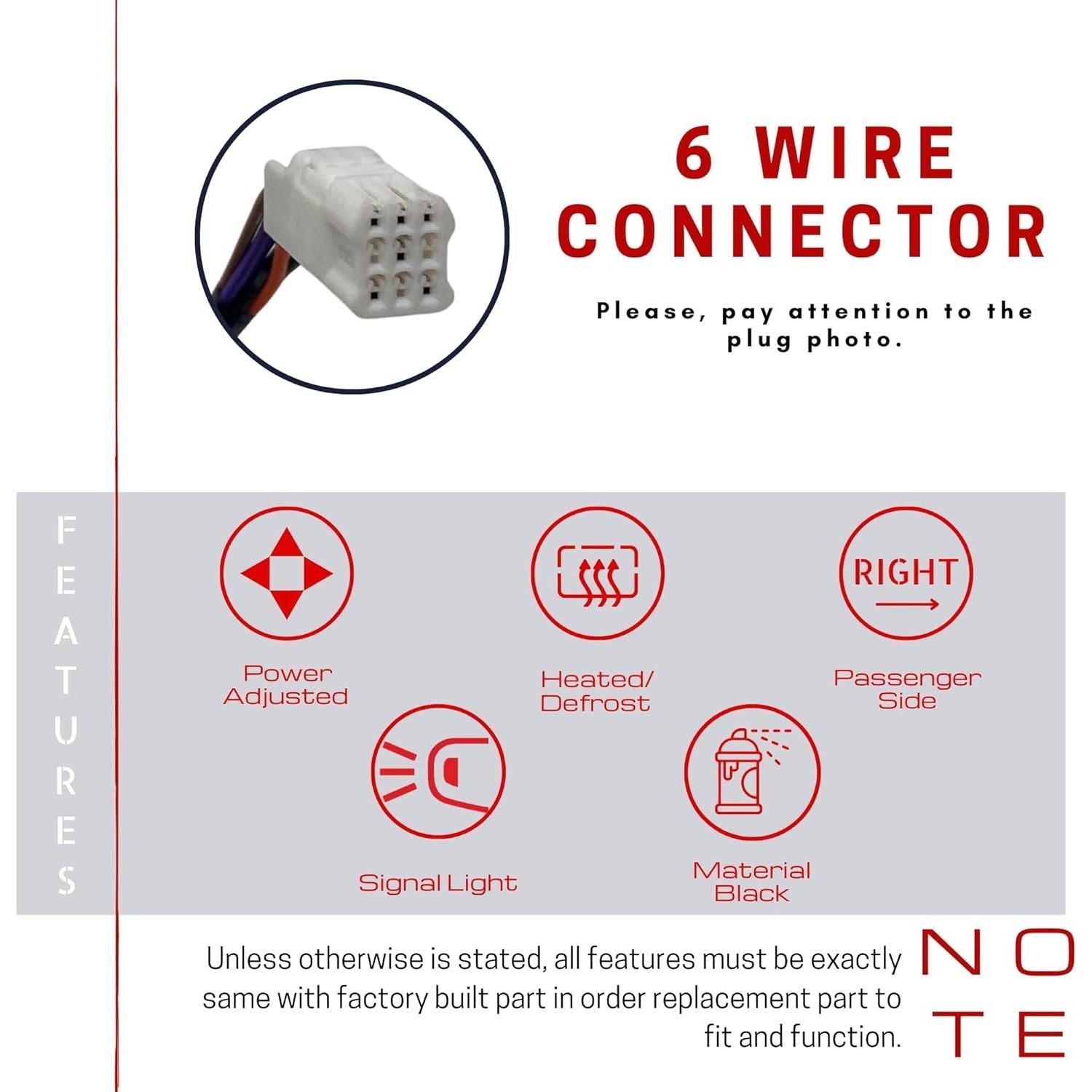 - Mirror Specifications and Features : Power Adjusted Glass , Heated , Manual Fold , Turn Signal Indicator , PTM Cover , 6 wires