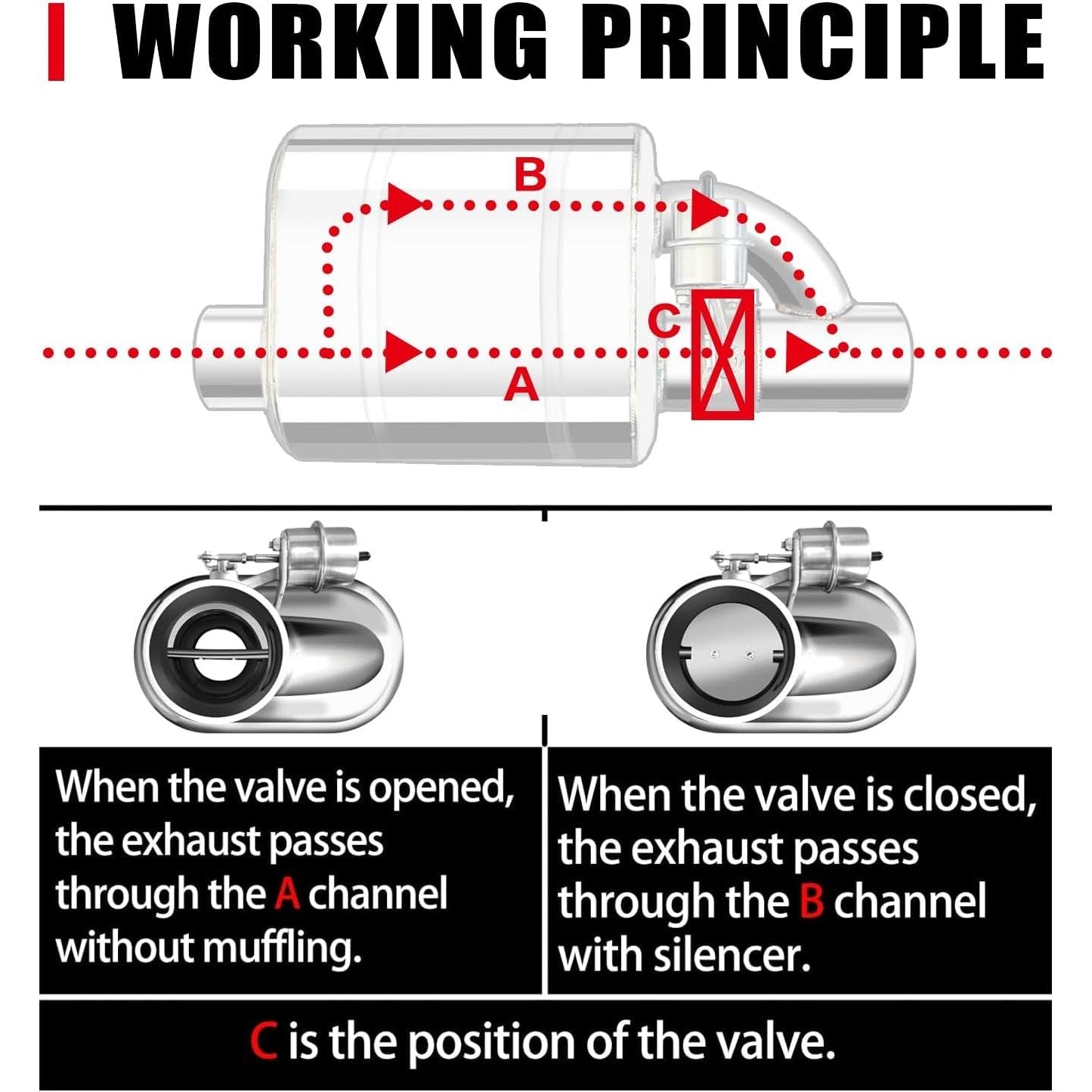 - When the remote control is pressed to open, the exhaust passes through the straight part, releasing a loud aggressive sound.