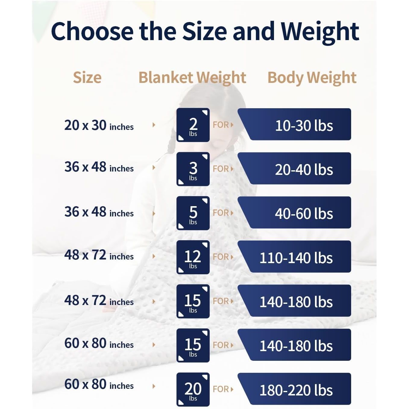 • Choose the Right Size and Weight: We recommend a blanket that is about 10% of your body weight. Our carefully selected weights of 2 lbs, 3 lbs, 5 lbs and 7 lbs are suitable for different age groups of 30-40 lbs, 41-60 lbs and 61-85 lbs respectively. For taller , a larger 7lbs blanket is recommended