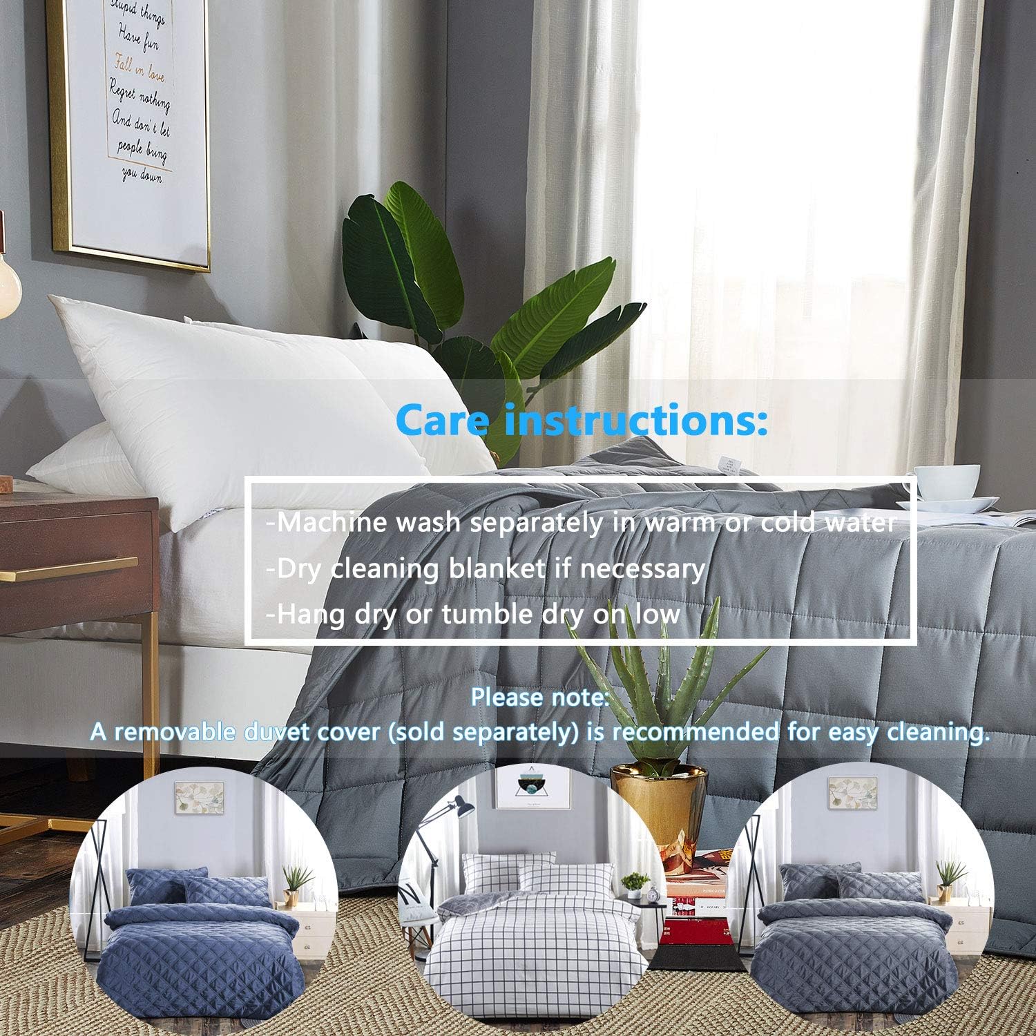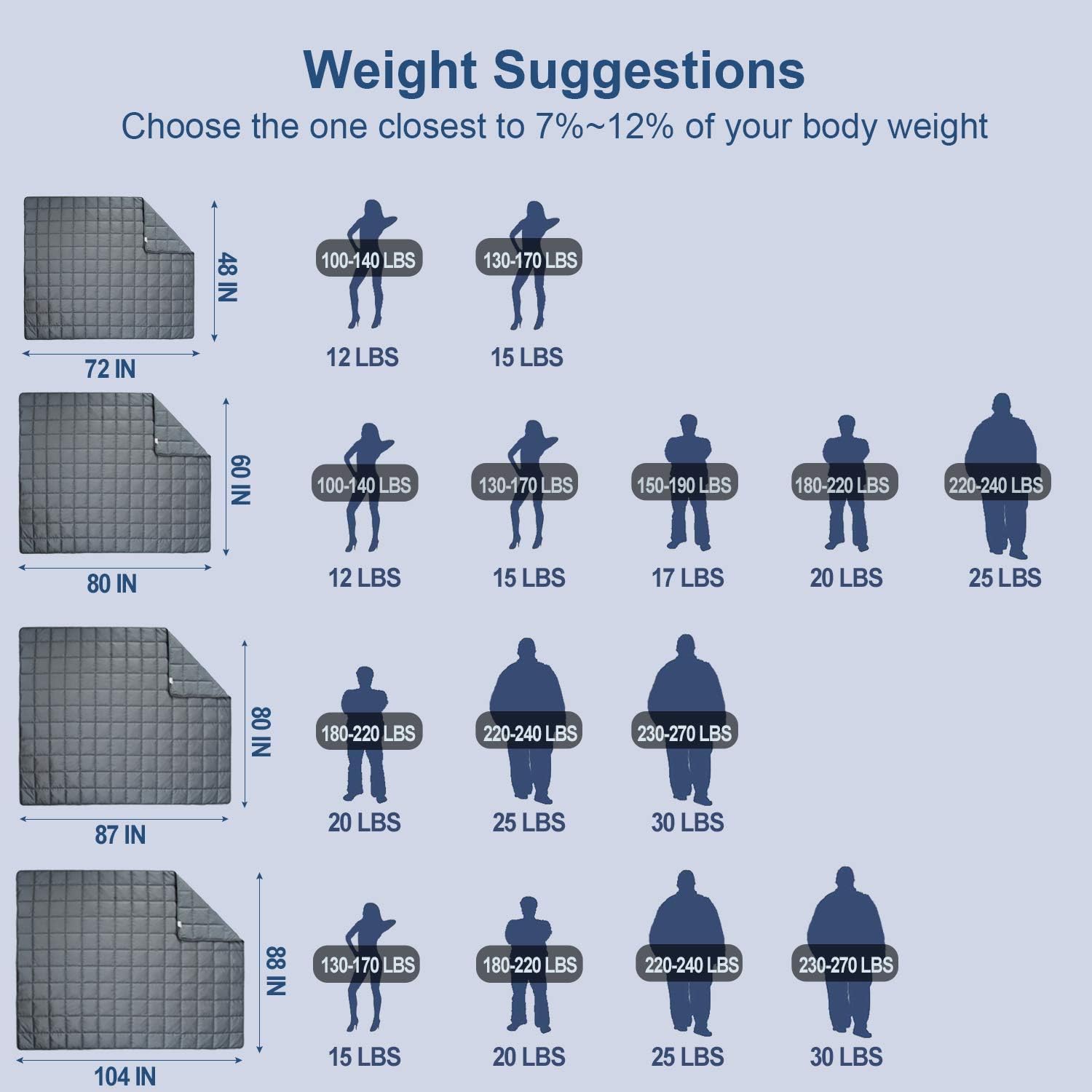 • WEIGHT&SIZE--The weighted blanket is available in multiple weight options ranging from 5 to 30 pounds. Please choose the blanket weight according to your body weight.48''x72'' for twin bed, 60''x80'' for queen bed.Due to its weight, a removable duvet cover (sold separately) is recommended for easy cleaning. Note: A twin, queen or king size weighted blanket is much smaller than the corresponding size regular blanket or comforter