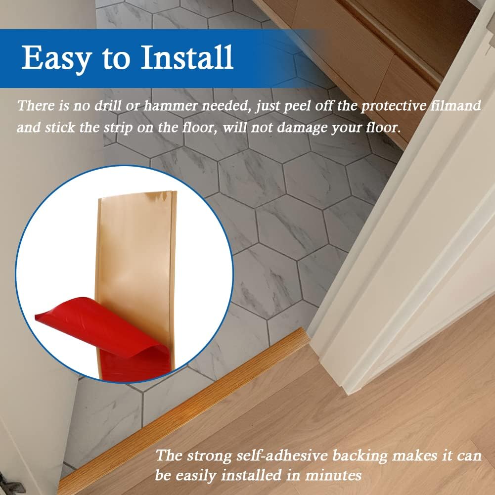 - 【Convenient Design】With peel and stick design and strong self-adhesive feature, the floor cover strip is easy to cover gaps, cracks and damaged corners, which just need to apply with firm pressure, no extra tape is required. The gap-floor can be repaired quickly with this practical flooring transition strip in fast and easy way.