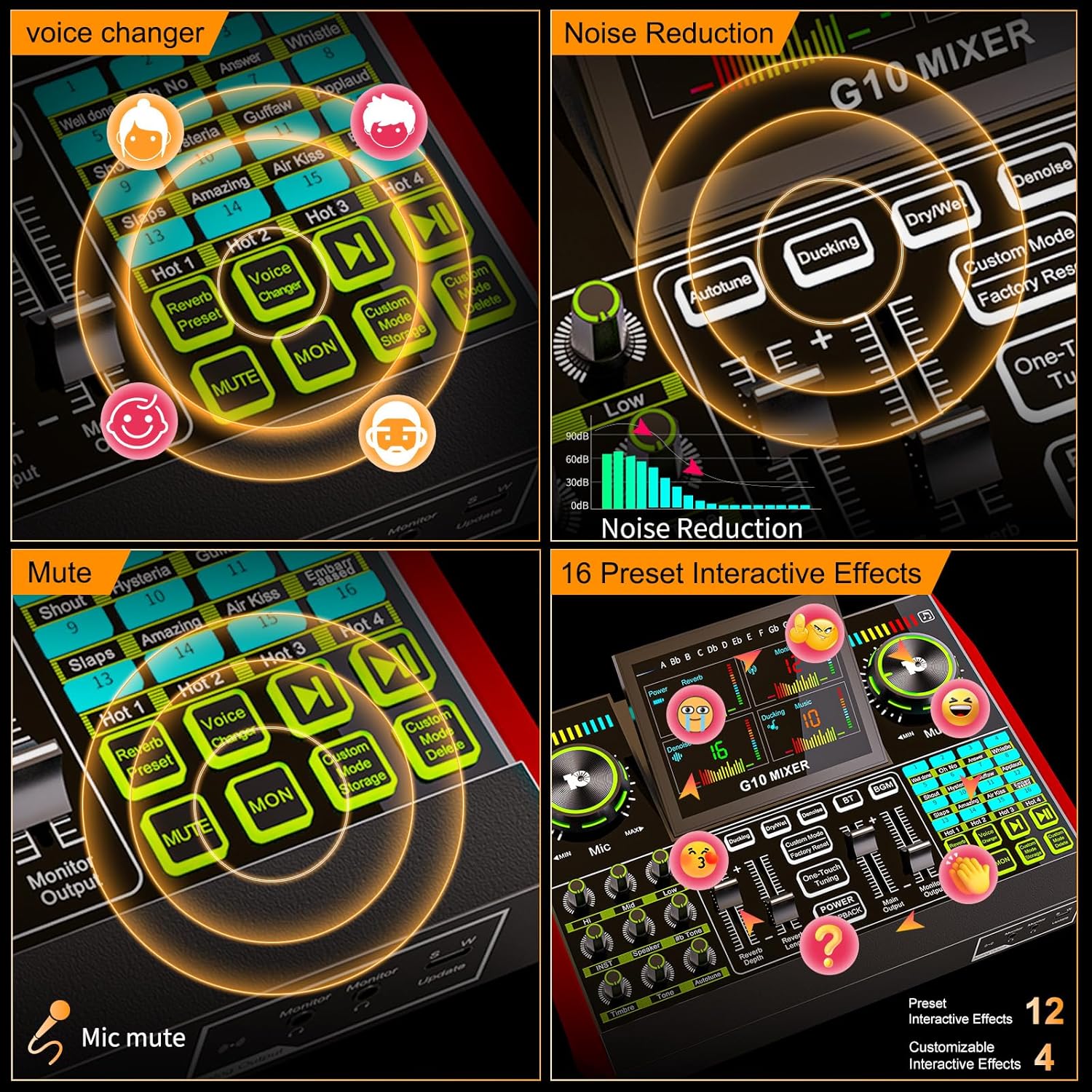 - Special Features: G10 podcast mixer can save your different voice modes, including the parameters of the all of volumes, all of voice effects, a total of 19 modes can be saved, great for different scenes need. Just you set up,save, switch to it, and you live stream or podcast with it.