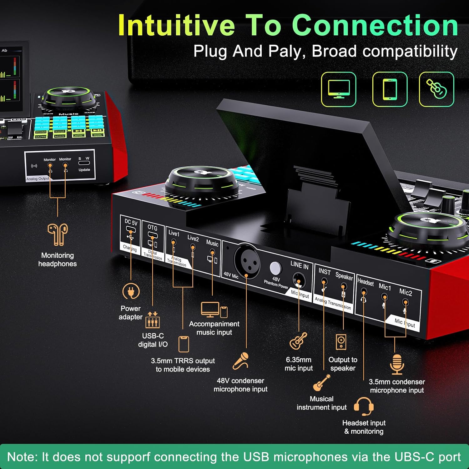 - Studio Quality Recordings for Streaming and Podcast: Studio mic premium low-noise preamp, as well as Dual DSP processors, make your XLR mic sound great with 48V phantom power. And also supporting the simultaneous inputs of 6.35mm dynamic mic, 3.5mm mic and headset mic, achieve multi-person input.