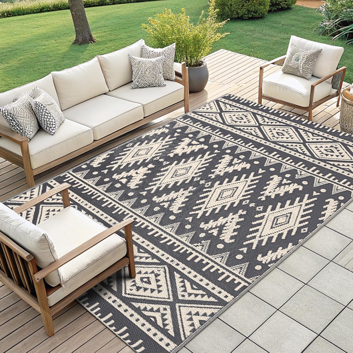 - PREMIUM MATERIAL: Made of 100% virgin polypropylene, this outdoor rug features double-sided weaving for added durability. With flat stitching, neat edges, UV coating, and heat-treated edges, it resists fading, sun damage, and wear for long-lasting use.