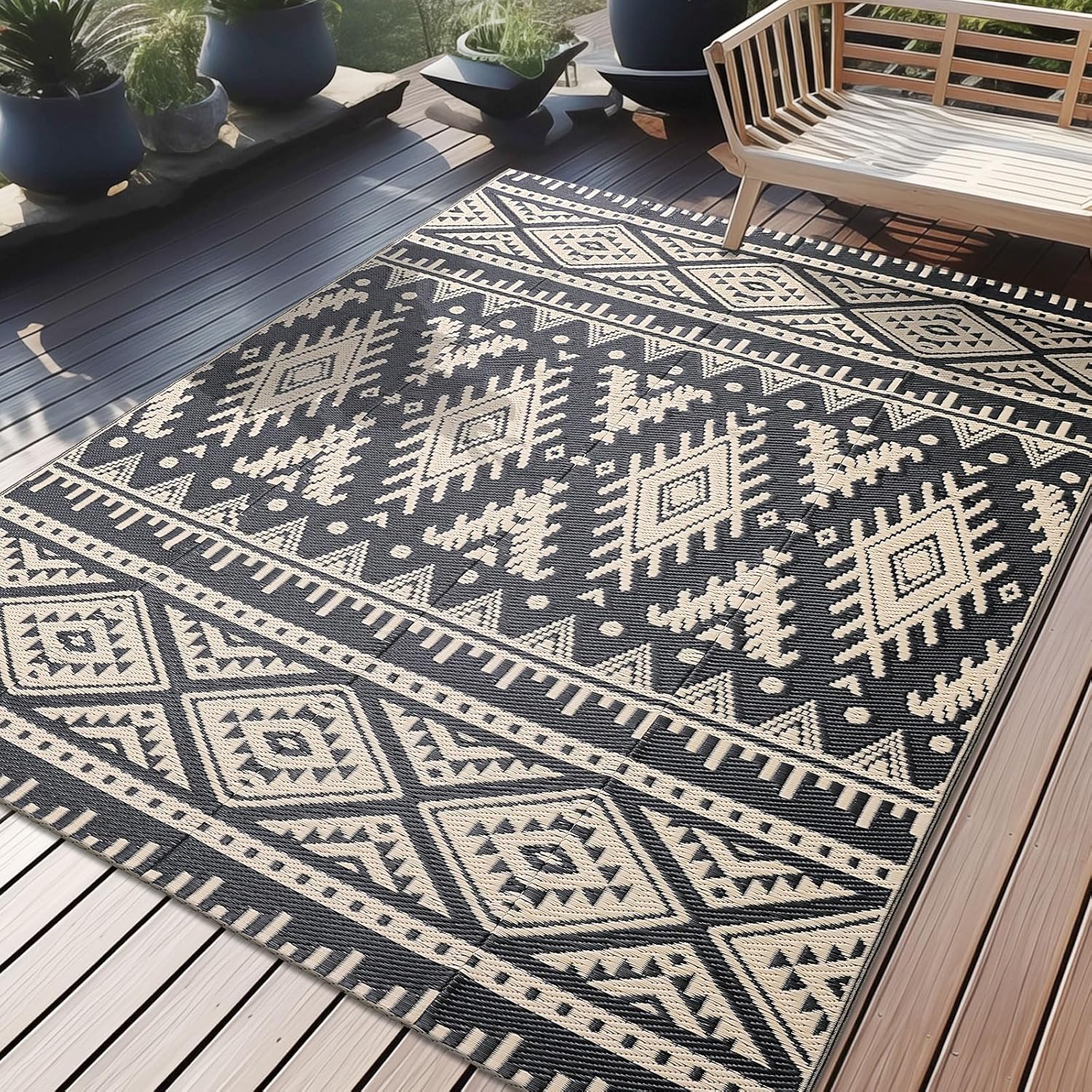 - REVERSIBLE & PORTABLE: This outdoor patio rug boasts dual-sided patterns, providing versatile color options and extended durability. Complete with a handy carry bag, it's perfect for outdoor activities.