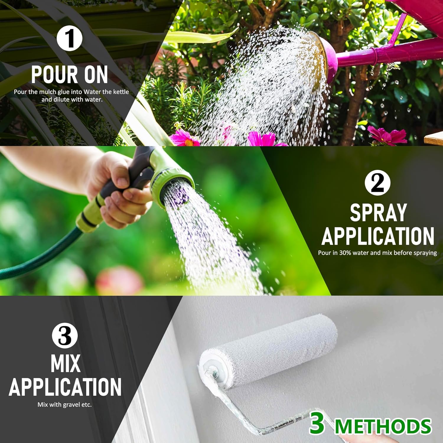 - Powerful and Versatile Landscape Adhesive: Our landscape glue, including mulch glue for landscaping, rock glue, and gravel binder, is a superior adhesive that effectively holds small gravel, pebbles, mulch, and other organic materials in place. It provides a strong, durable bond that withstands erosion and displacement from wind and rain while allowing water to pass through. This adhesive is suitable for various landscaping applications, including pathways, planting beds, and slopes, and works well with materials like pea gravel and crushed stone.