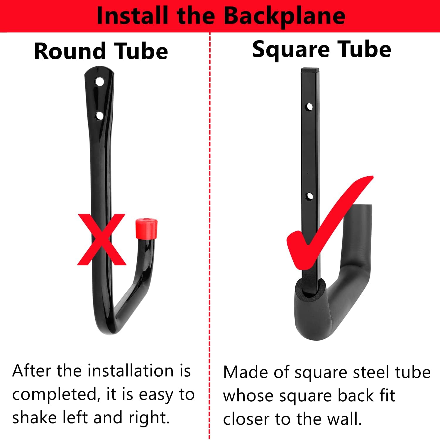 • 【Heavy Duty Materials】Garage hooks are made of high quality square steel tube whose square back fit closer to the wall and can support up to 55 pounds, you can use two hooks as a match to hang heavy objects.