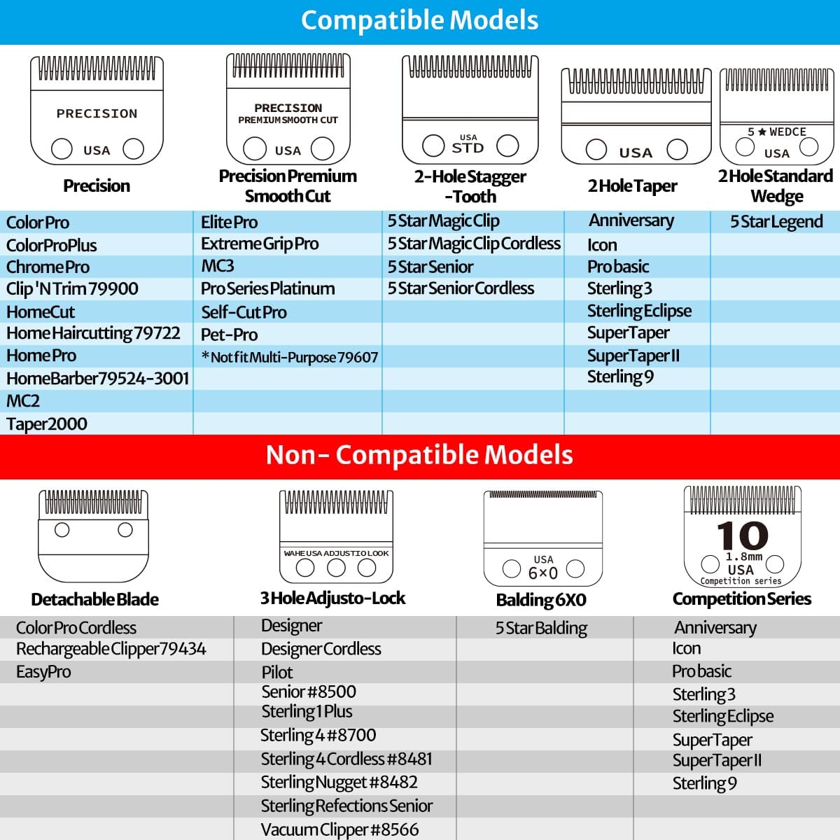 - 【Fit models】 Blades compatible with Wahl Precision, Precision Premium Smooth Cut, 2-Hole Stagger-Tooth, 2Hole Taper and 2Hole Standard Wedge blades. Please refer to the table for the clippder's model.
