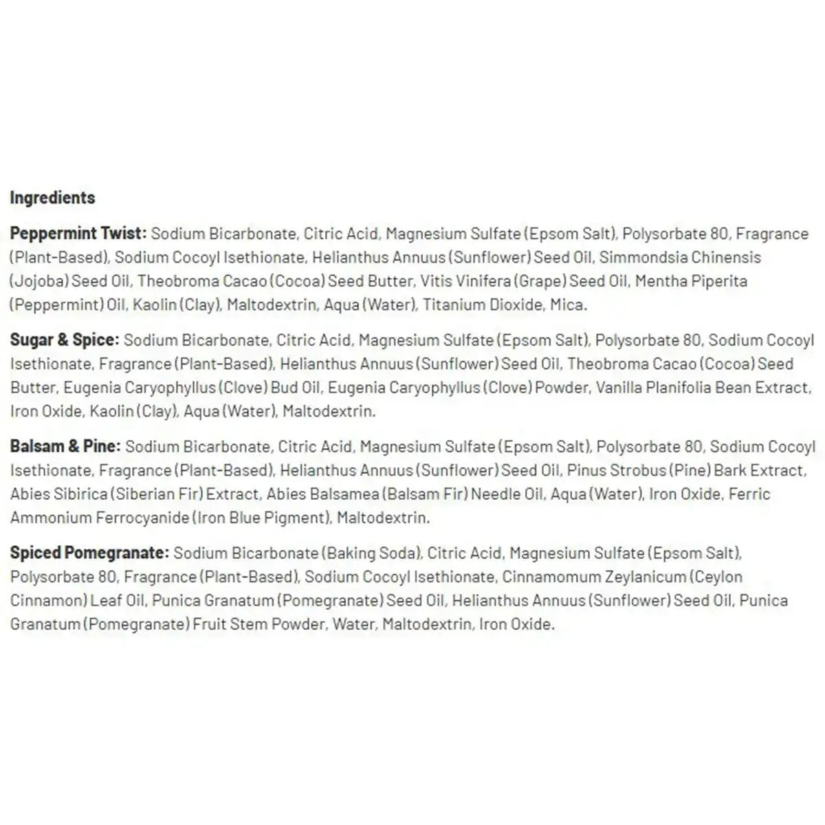 Bath time just got better! Experience four of our top limited edition bath bombs including Spiced Pomegranate, Sugar & Spice, Balsam & Pine and Peppermint Twist. Mix & Match your own combination for a uniquely you holiday self care soak!