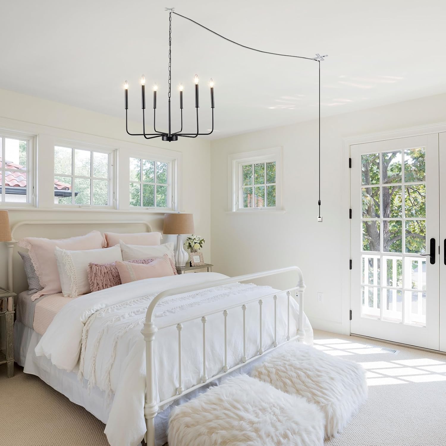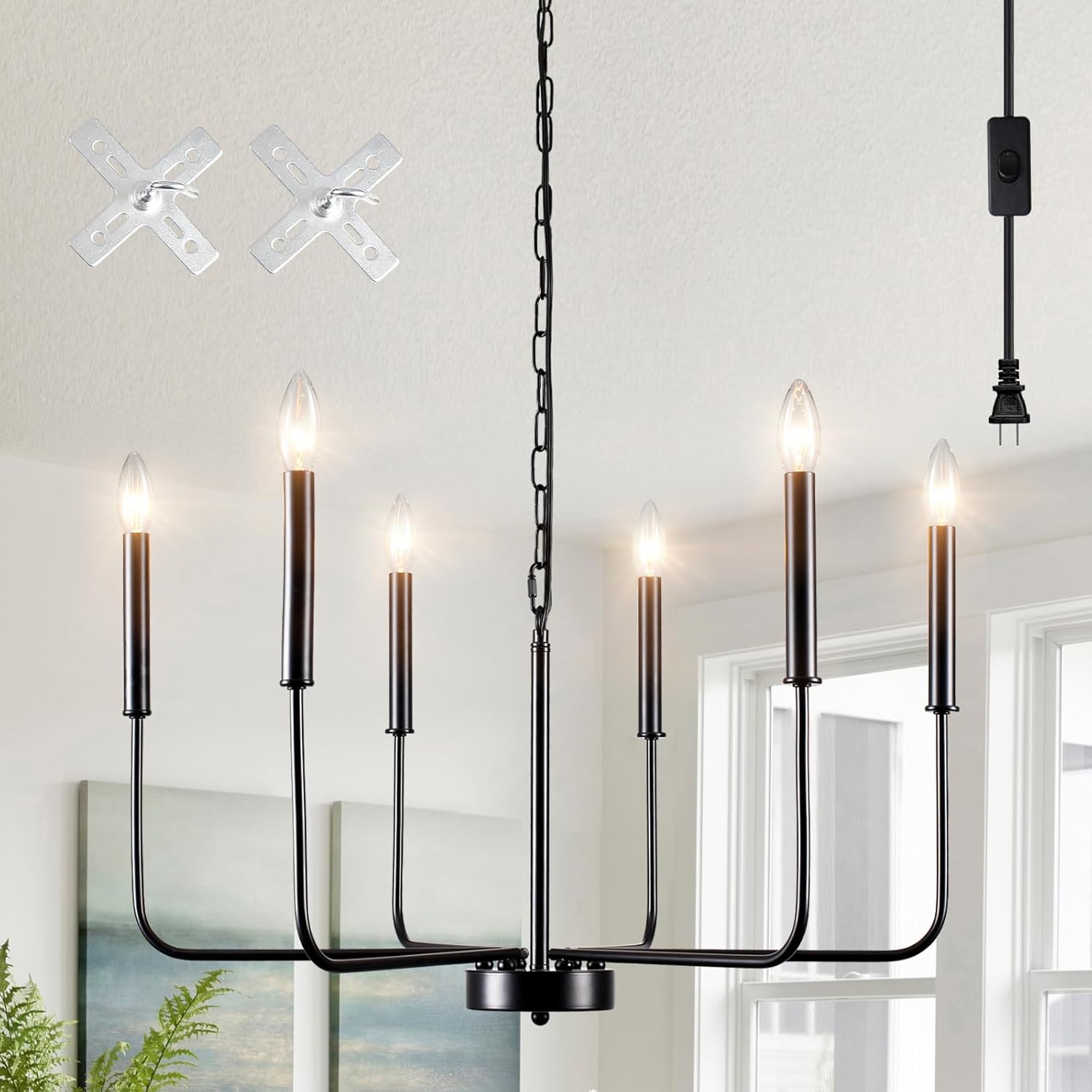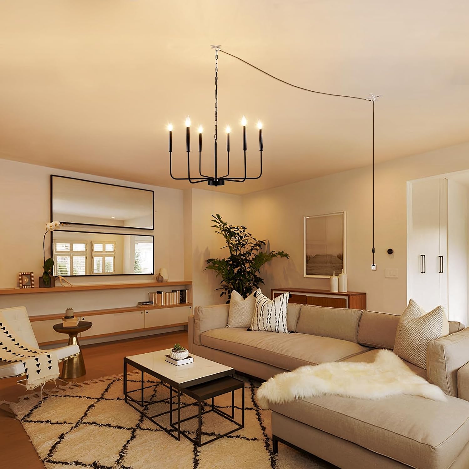 - 【Black swag lamp】This classic plug in ceiling light features 6 elegant arms and a matte black finish,simple and elegant. This plug in pendant light is anti-oxidant, non-fading and easy to clean.