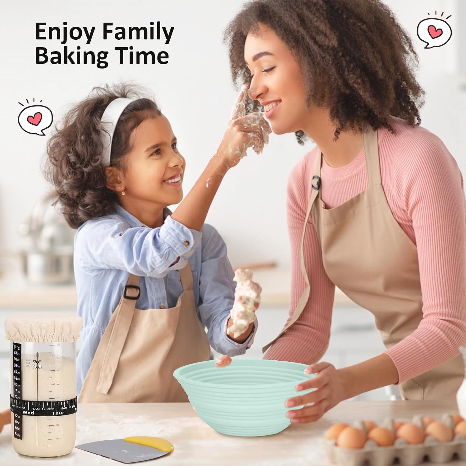 Everything you need to make homemade sourdough bread in one convenient set. Includes a 34oz wide-mouth glass jar, Dutch oven bread sling, 11" silicone spatula, 9" round and 10" oval silicone proofing baskets, feeding time tracker, thermometer band, cloth cover, bread scoring knife with 5 replaceable blades, metal scraper, silicone brush, and instructions. Perfect for beginners and experienced bakers. 🎁