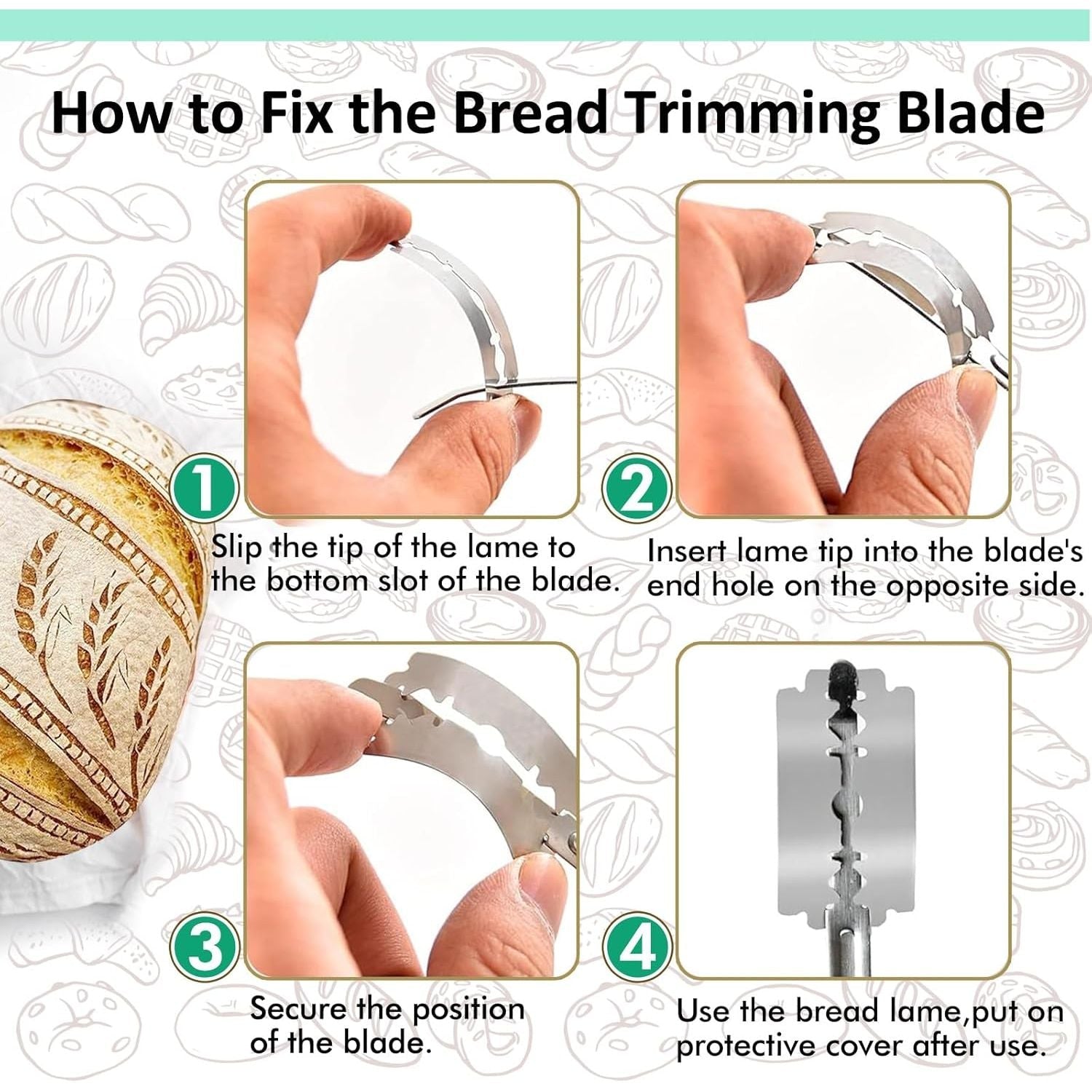 Bread scoring knife with 5 replaceable blades and metal scraper allow precise cutting and creative designs. Ideal for artisan sourdough baking at home.