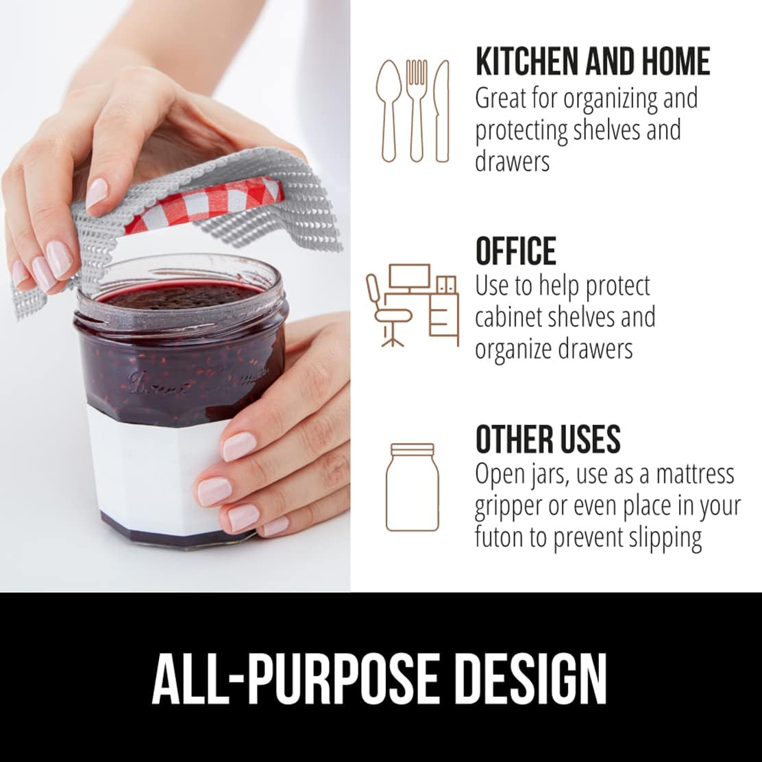 - EXTRA STRONG GRIP NON-ADHESIVE LINER: the Gorilla Grip powerGRIP liner is a non adhesive and tear resistant liner engineered with the highest quality materials to reduce slipping and bunching in your drawers or cabinet shelves; superior gripping technology keeps both the liner in place on surfaces