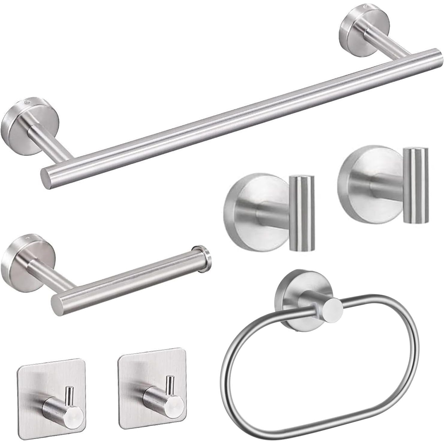 - Wide Application : Our bathroom towel holder set can be your home organizer to keep space neat and tidy. The 7 pieces bathroom hardware set can be used in the bathroom, closet, kitchen cabinet, laundry room, toilet. It can hold your bathrobe, bath towel, pants and shirt, swimsuits, coats, bags or other stuff.