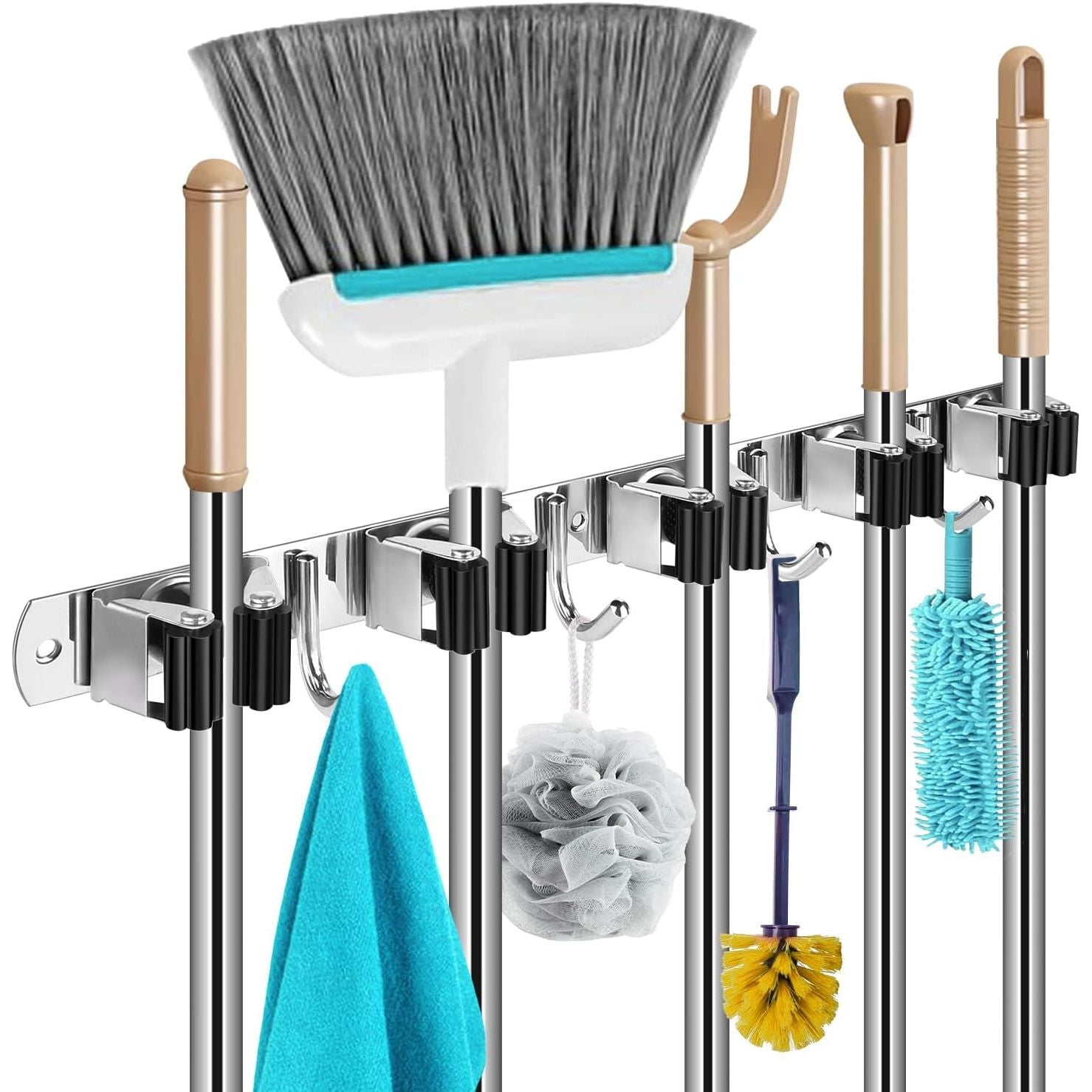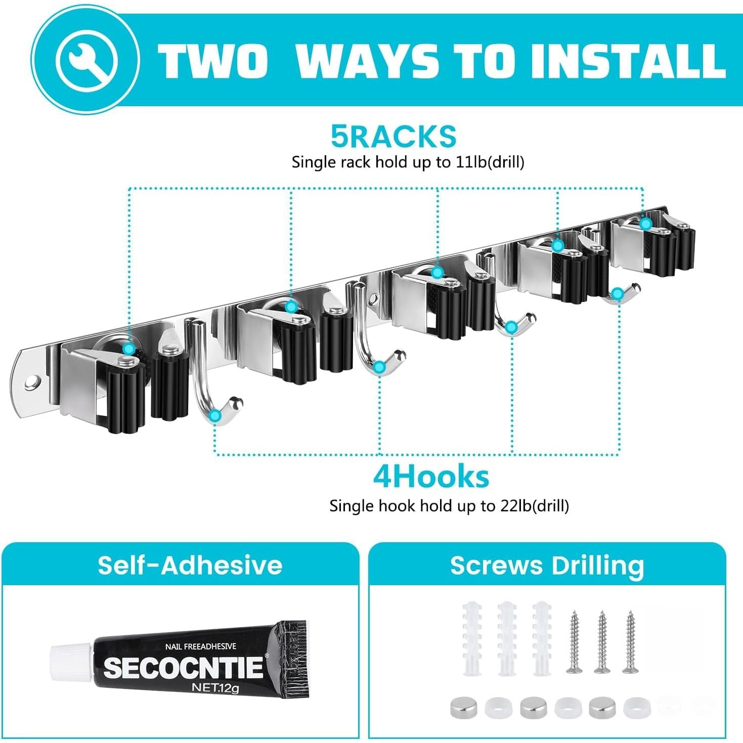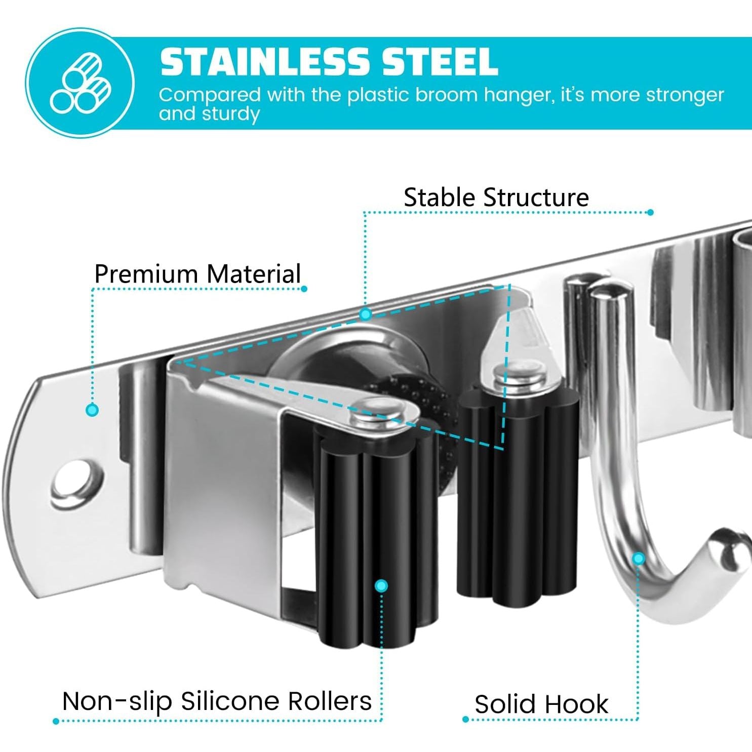 - 【Stainless Steel Material】This broom hooks wall mounted cleaning rack is made of SUS 304 stainless steel. It is more robust than the aluminum and plastic holder, anti-rust and anti-corrosion.It can bear about 20kg.
