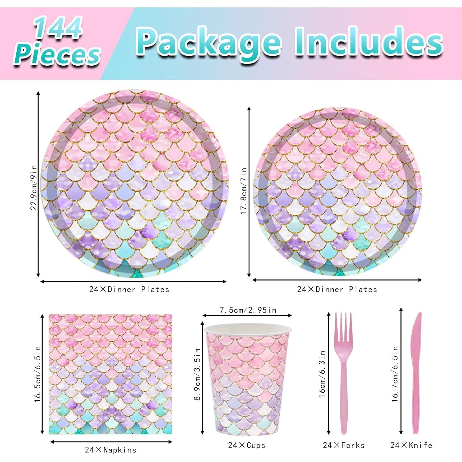 • 144 PIECES MERMAID BIRTHDAY PARTY SUPPLIES: This mermaid theme birthday party tableware set that serves 24 people has 144 pieces, including 24 x mermaid dinner plates (9 inch), 24 x mermaid dessert plates (7 inch), 24 x mermaid cups, 24 x mermaid napkins, 24 x pink forks, 24 x pink knives. Meet all your mermaid theme birthday party decoration needs in one step.