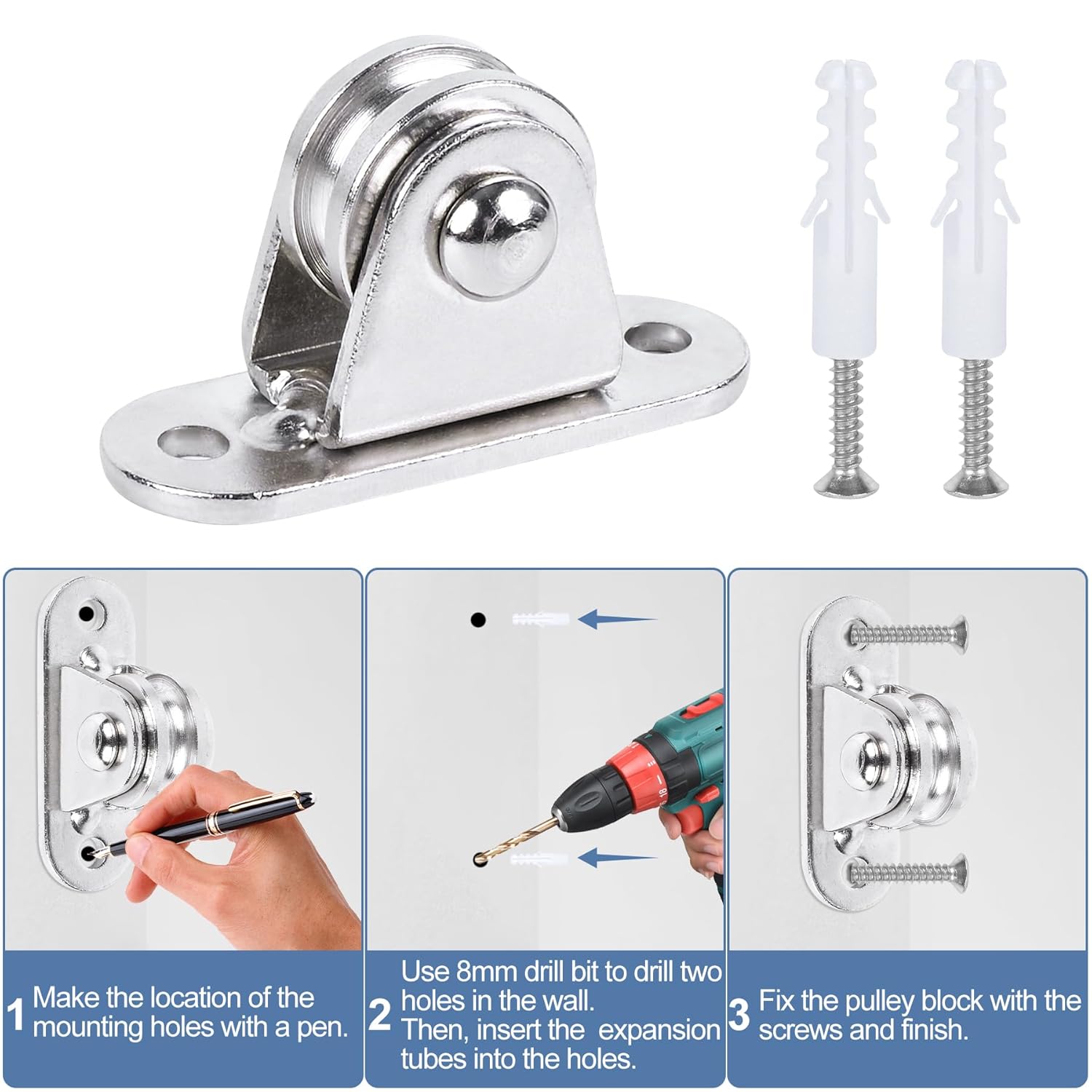 - 【Easy installation】 Equipped with screws and expansion pipes, the wall mounted pulley is simple to install. First, make the location of the mounting holes with a pen. Next, use 8mm drill bit to drill two holes in the wall. Then, insert the expansion tubes into the holes. Finally, fix the pulley block with the screws and finish