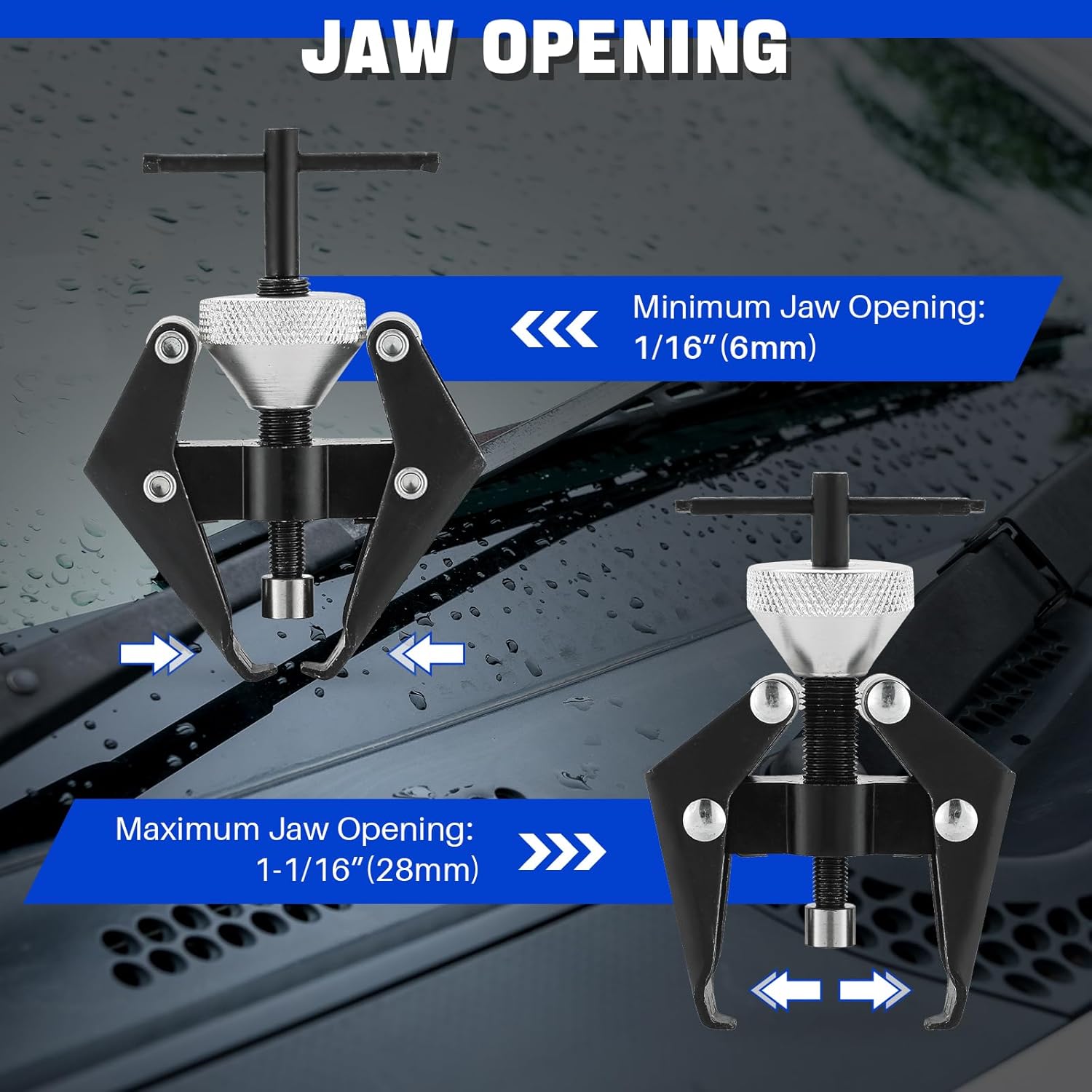 • Size: The relevant specifications of the wiper arm puller are jaw opening: 1/16" - 1-1/16" (6-28mm) and outer diameter:1-7/8" (48mm)