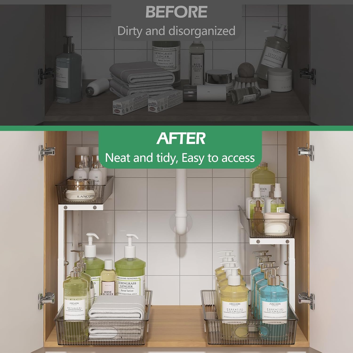 ADRIMER Under Sink Organizer 2 Packs, Pull Out Kitchen Sink Organizer Height Adjustable, 2 Tier Slide Out Kitchen Organizers and Storage Metal Cabinet Storage Shelf, Transparent & White - Just Closeouts Canada Inc.