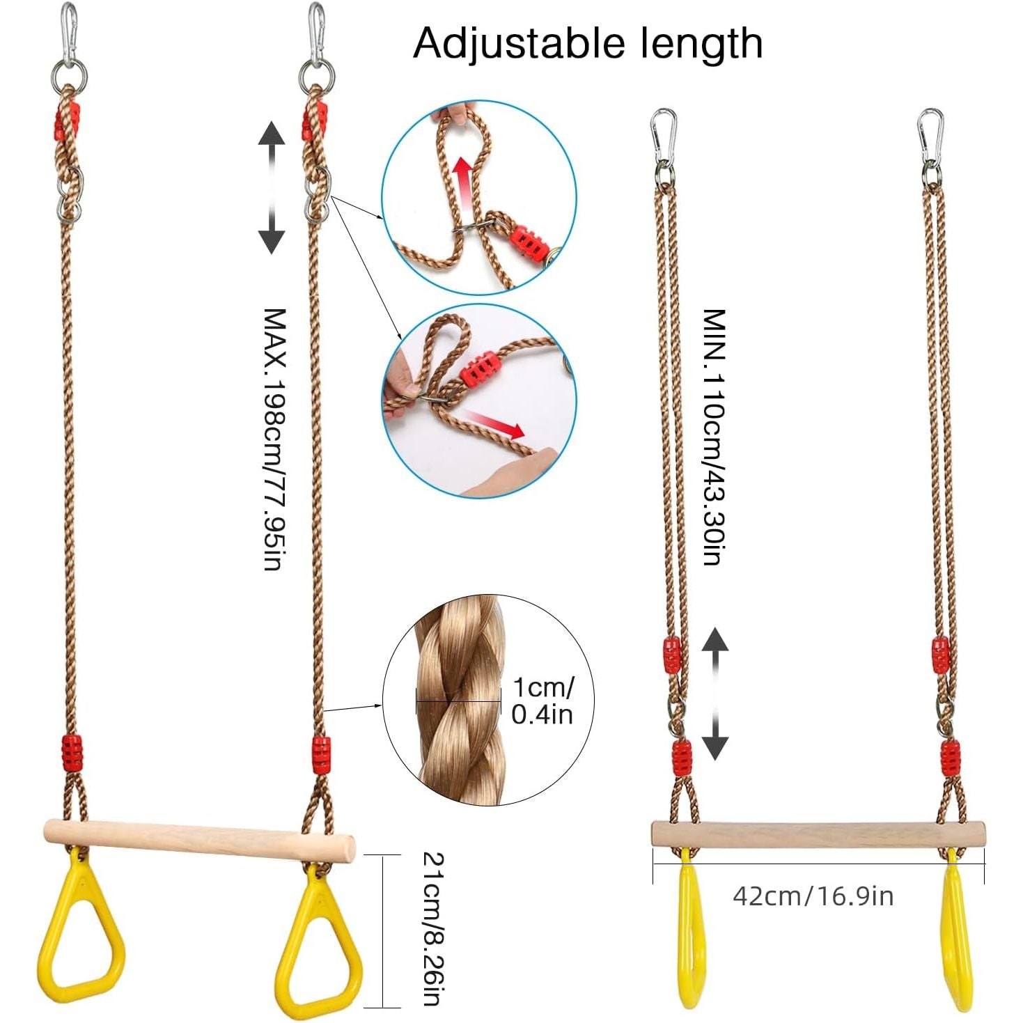 - ใ๐๐๐๐๐๐๐๐๐๐๐๐๐&๐๐๐๐ใ- The upgraded thoughful pressing buckle provide more stable combination of the rope and swing; The super wear-resisting and sturdy rope is up to 10 mm in diameter, more than 352LB/ 160KG load-bearing, adjustable in length. Length: Max:198cm/ 77.95inch Min:110cm/ 43.3in.