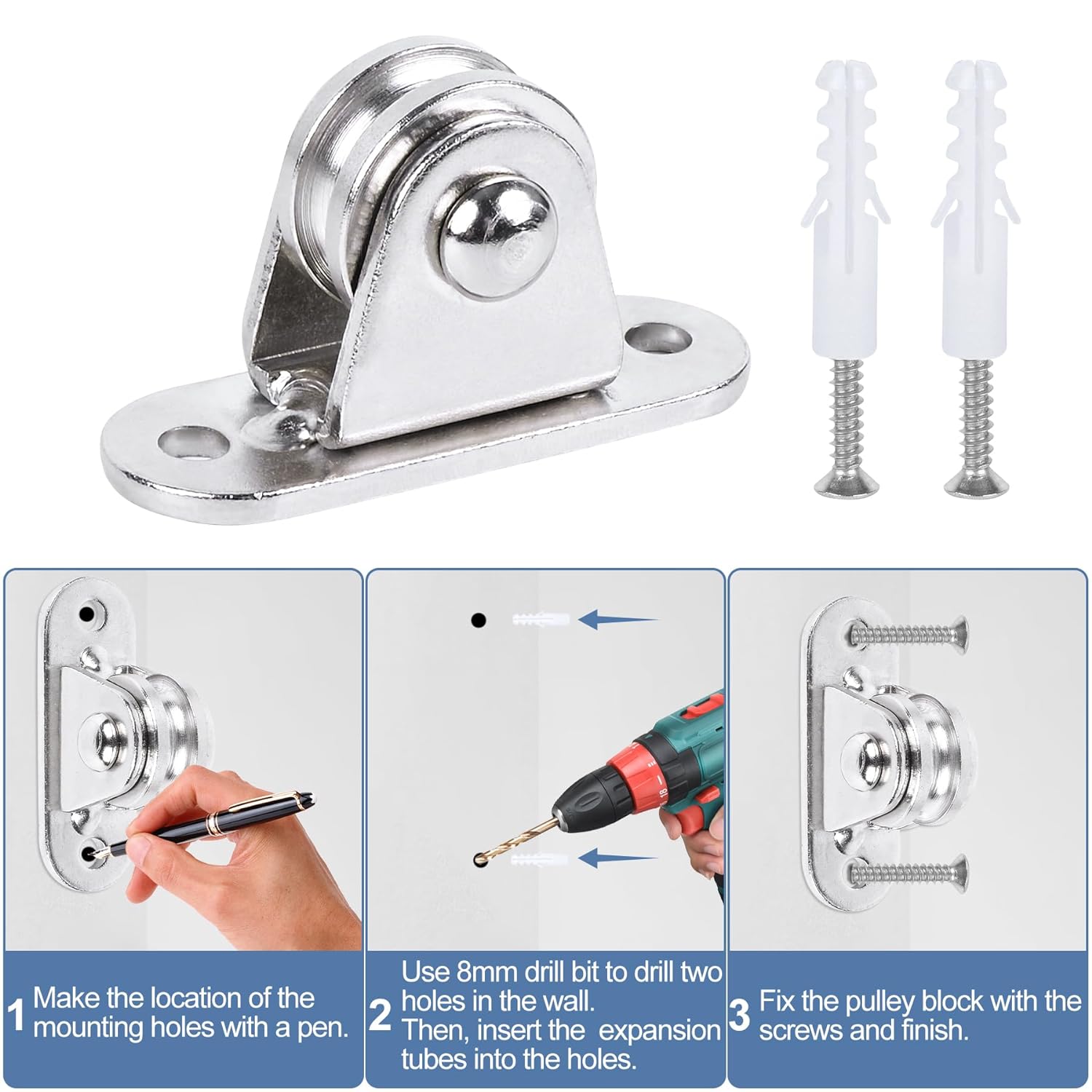 【Easy installation】 Equipped with screws and expansion pipes, the wall mounted pulley is simple to install. First, make the location of the mounting holes with a pen. Next, use 8mm drill bit to drill two holes in the wall. Then, insert the expansion tubes into the holes. Finally, fix the pulley block with the screws and finish