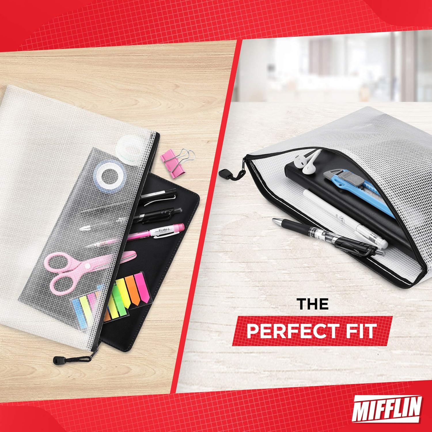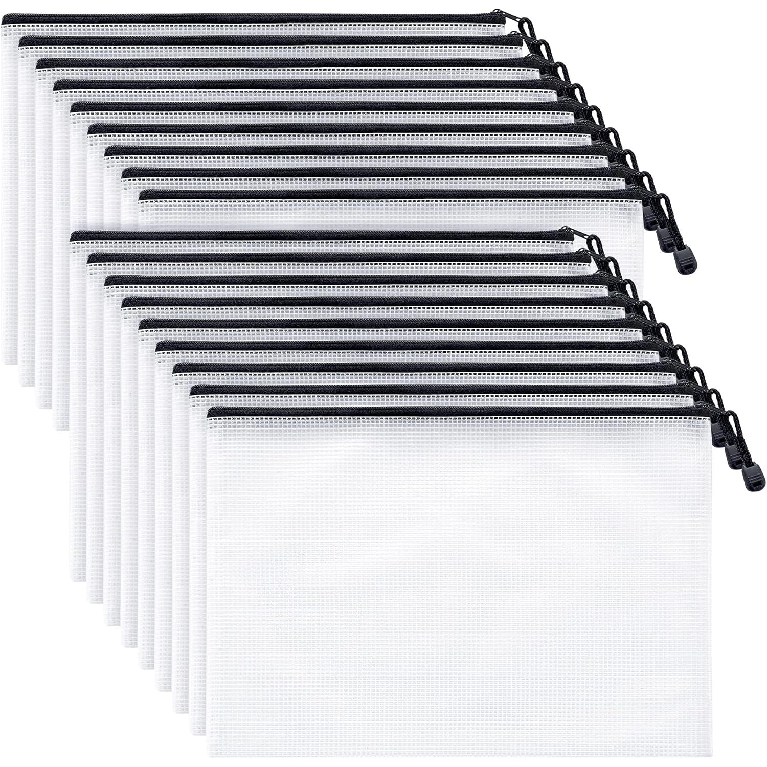 - INCLUDES - 24 Mesh zip pouches (White with black zip); These clear, plastic zip envelopes have medium transparency for visibility yet maintains document privacy