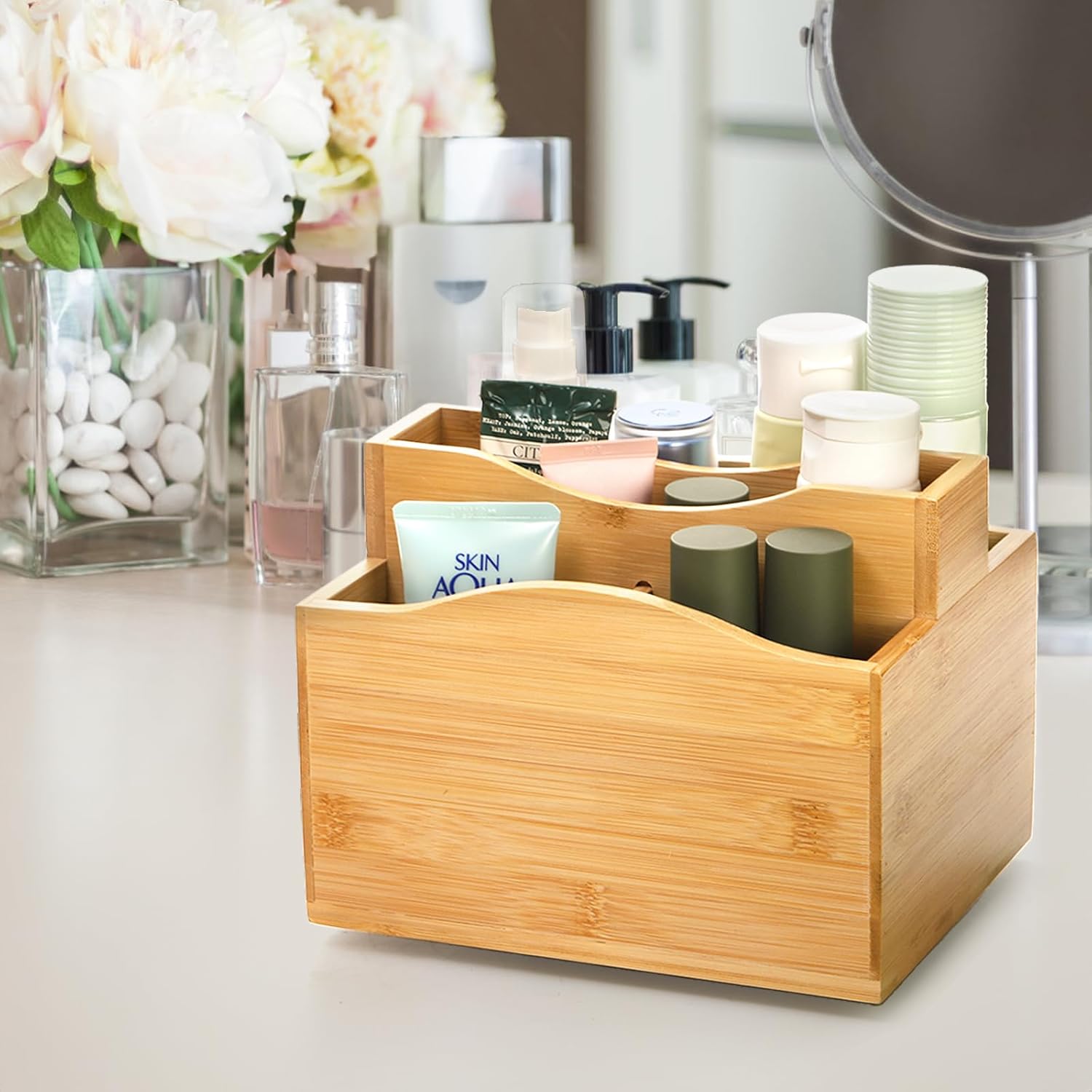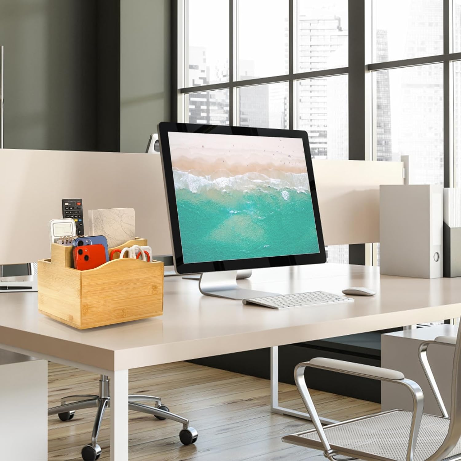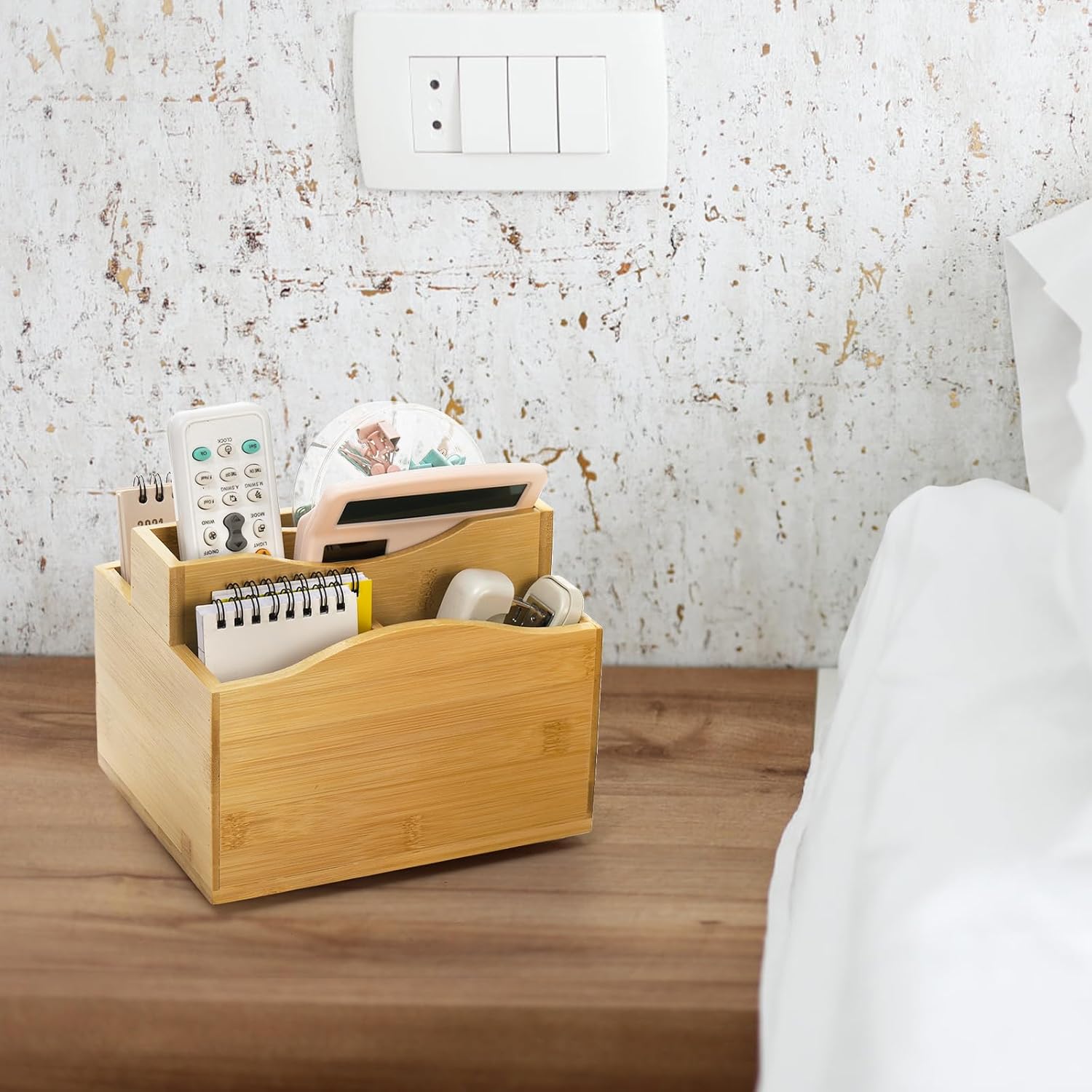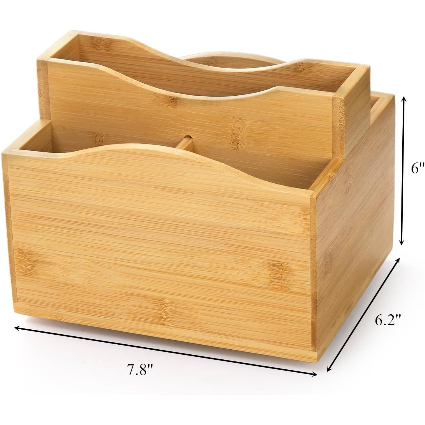 • Package and Material: Made of bamboo and the plastic base, our remote control holder is sturdy, measuring 7.8''L x 6.2''W x 6''H. Designed with 5 compartments, sufficient and reasonable room to hold your remotes.