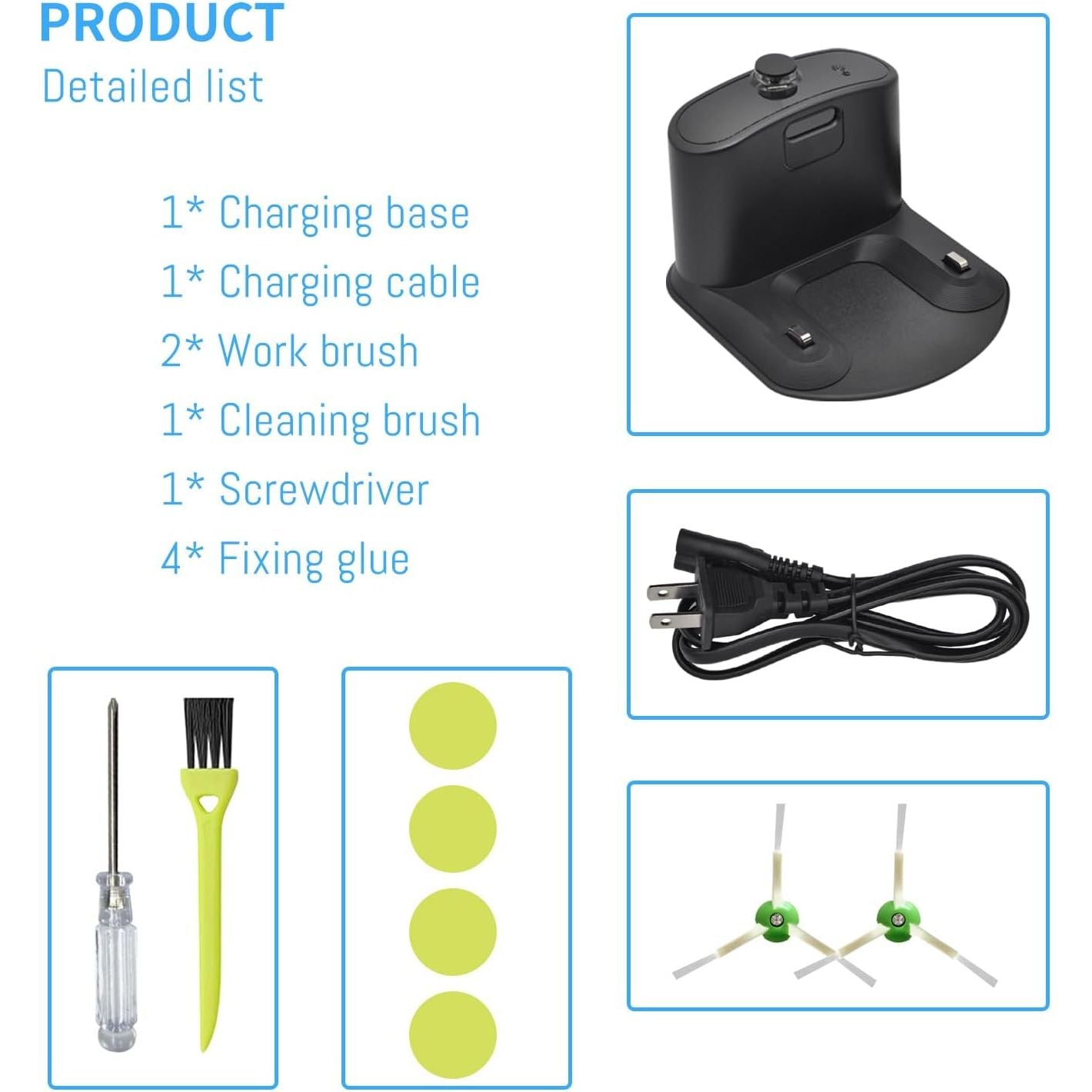 - Parts included: Packages includes:1x for irobot Roomba charging dock, a power cord (4415878) for easy charging. 2 Pack double-sided adhesive. 2 Pack Side Brushes. 2 screws. 2 Pack Screwdriver.