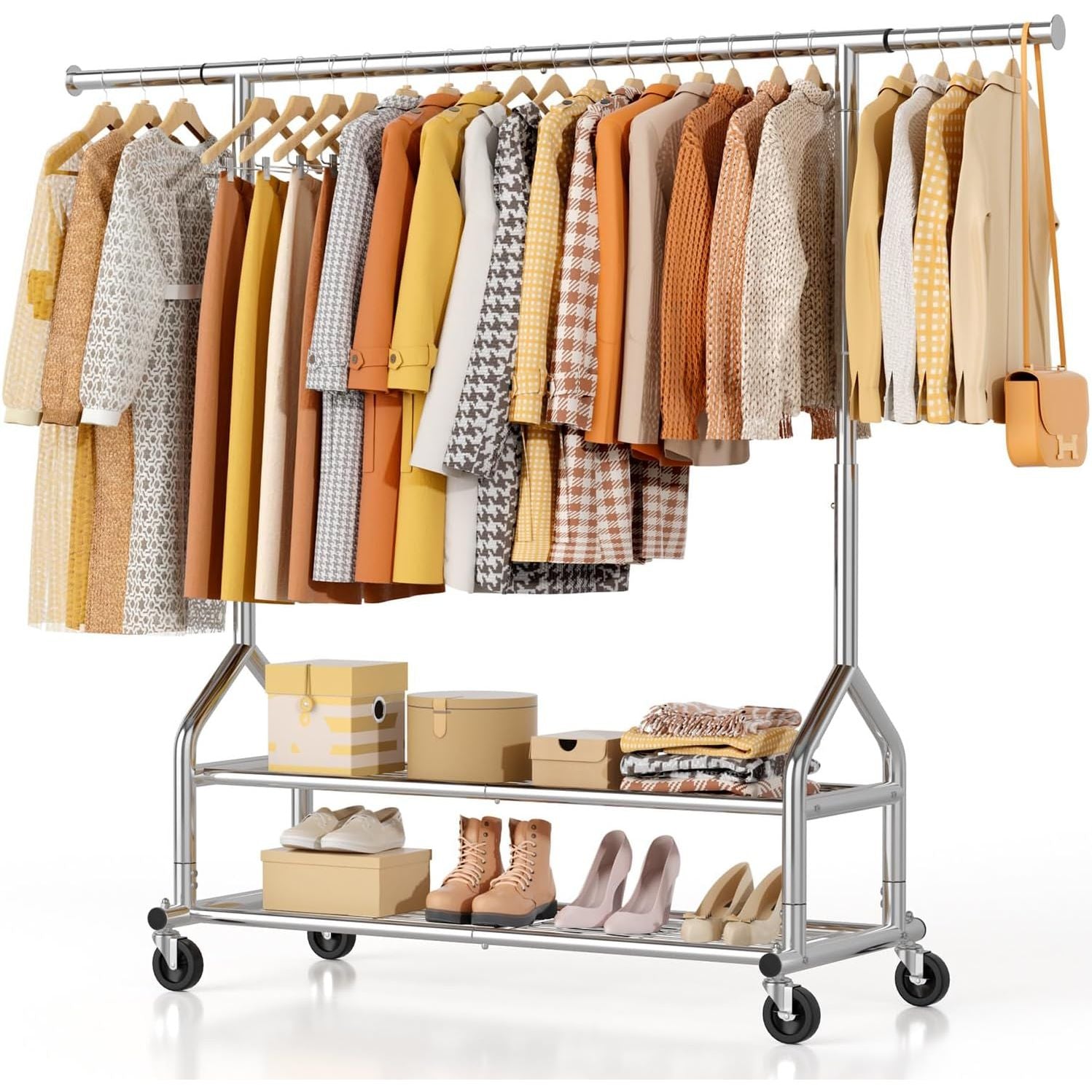 • Spacious Dual Shelves & Enhanced Stability: 19.7inch widened base and fixed shelves provide solid foundation, preventing wobbling or tipping, especially under heavy loads.The rolling clothes rack with 2 tier shelves,suitable for shoes, bins, or luggage, maximizing space efficiency.