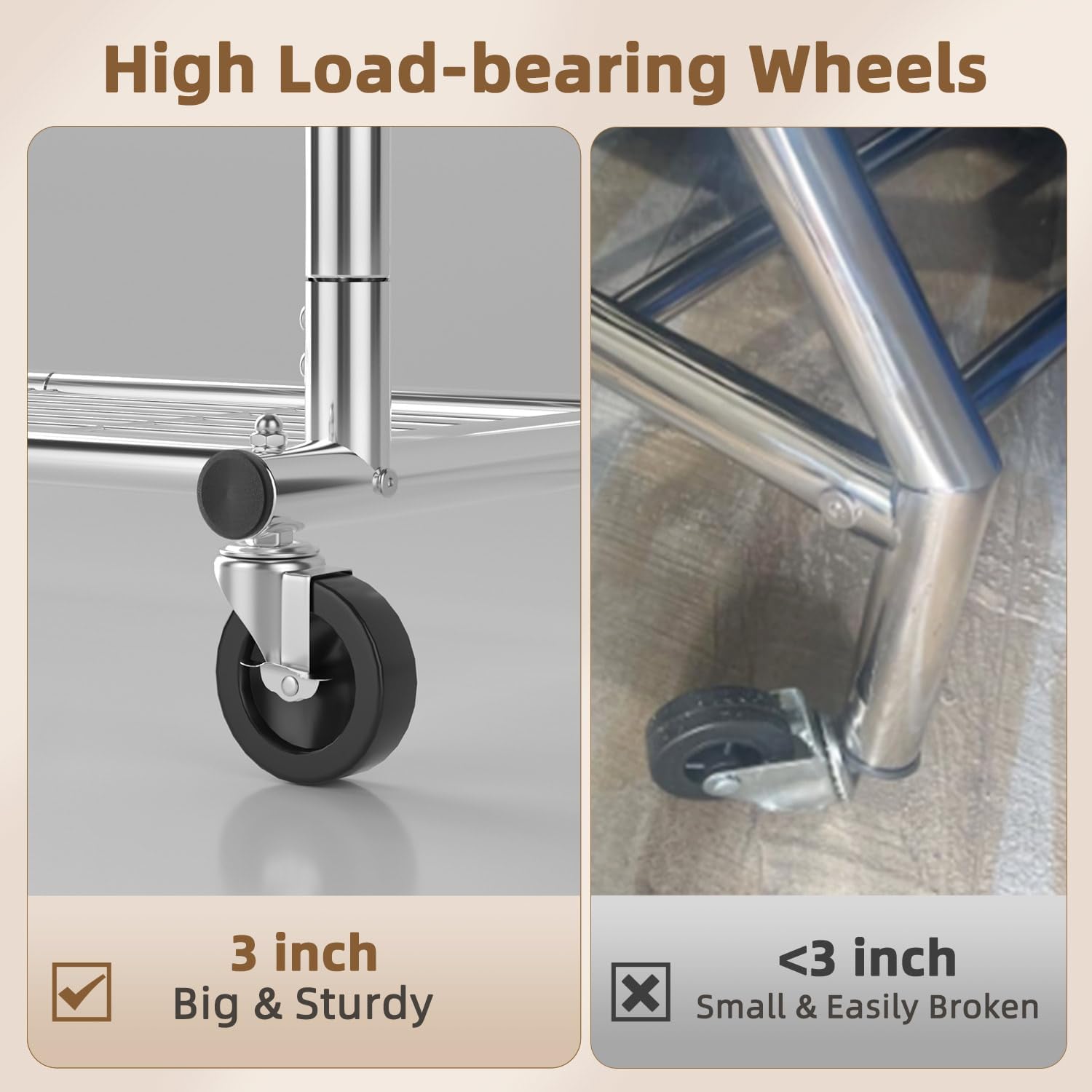 • Heavy Duty Wheels, Rolling Smoothly: 3 inch heavy-duty swivel wheels glide effortlessly on floors, tiles, carpets, or concrete. Locking brakes provide stability when stationary, making it easy for you to pick up or hang clothes.