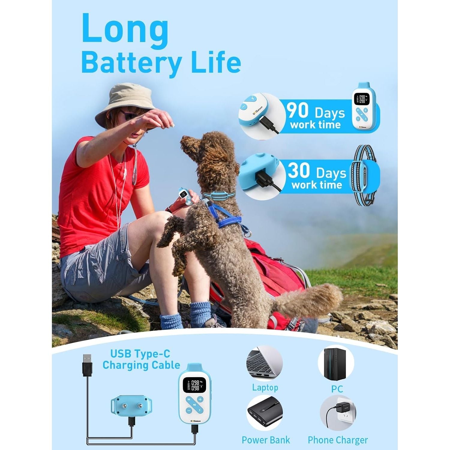 • Long Battery Life & Fast Charging - Built-in high-capacity rechargeable lithium-ion battery provides over 20 days of battery life for the dog shock collar receiver and over 45 days for the remote, with a full charge achieved in just 2 hours