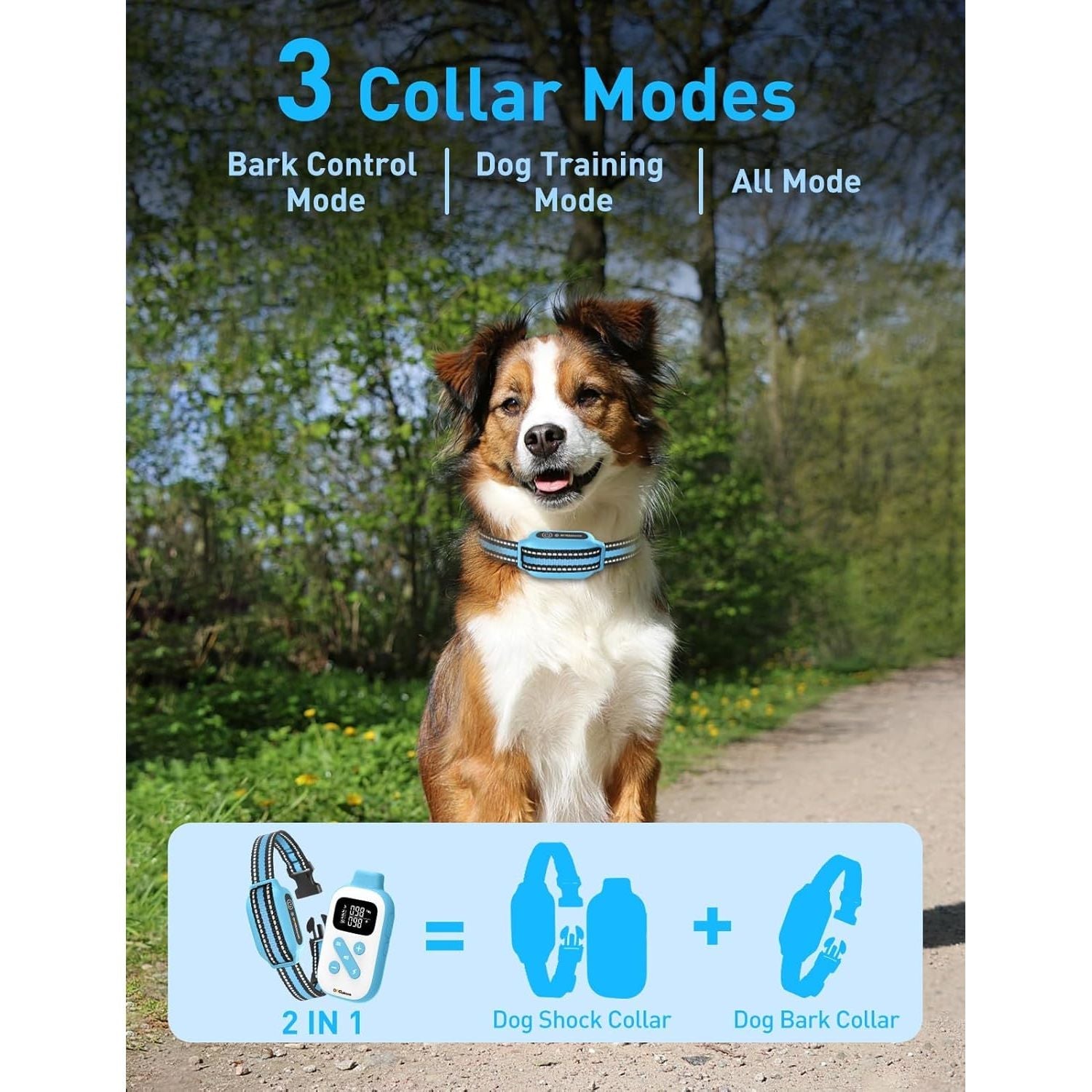 • Bark & Shock Collar Combo - The 2 in 1 collar features 3 training modes: Shock Collar Mode (9 Beep, 9 Vibration, 16 Shock), Bark Collar Mode (5 sensitivity levels), and Combined Mode. Shock Collar Mode corrects bad behaviors, while Bark Collar Mode auto stops excessive barking
