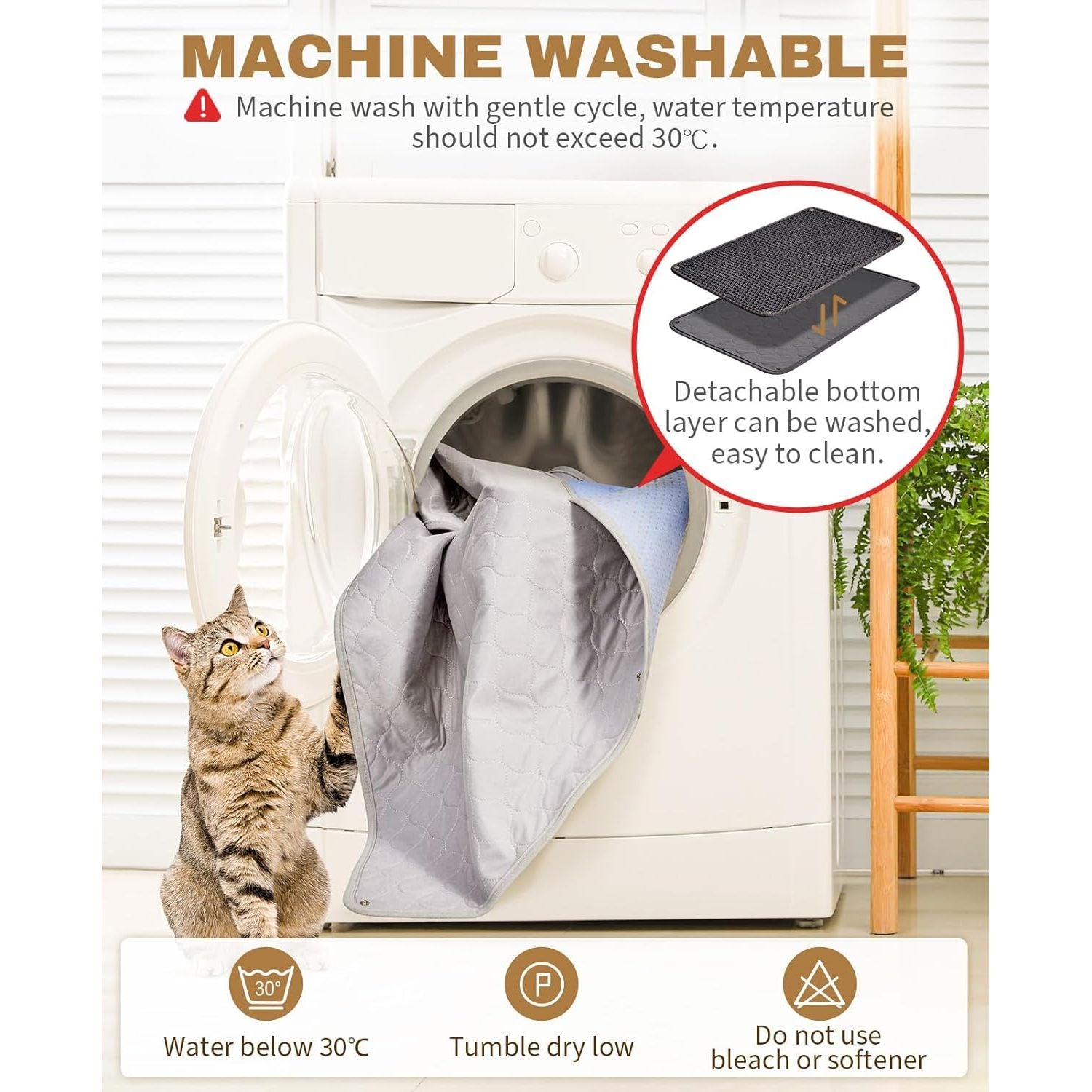 - Machine Washable Easy Clean Cat Mat: The upper layer is EVA material and the bottom layer is machine washable Polyester fabric, long-lasting and reusable. The litter mat can be opened on all 4 sides. Unbutton the 4 corners of the litter trapping mat, the bottom layer is made of machine-washable fabric, easy to clean without touch with urine and litter, saving time and effort. Use vacuum or damp cloth to clean the honeycomb layer. Cleaning up after your furry friend has never been easier
