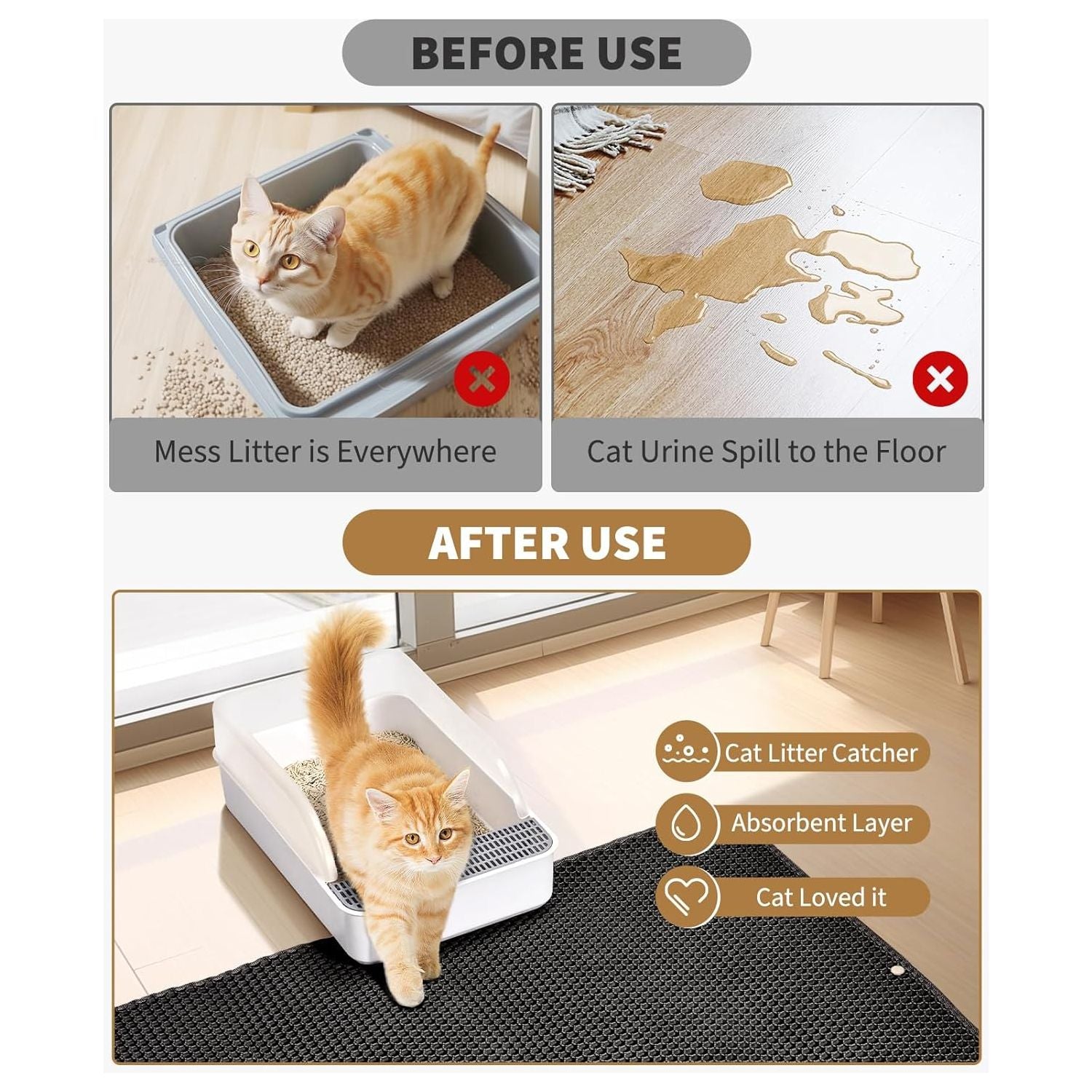 - Urine and Waterproof Double Layer Design: The bottom layer of the litterbox mat contains premium-quality absorbent, waterproof leak-proof fabric material to keep nasty cat urine and stains from seeping into the hardwood floor and carpet, keeping it clean and tidy. With non-slip design, your kitty will not slide when walking on the cat mats for litter